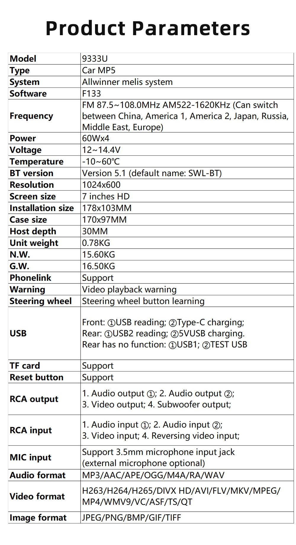 Audio format Audio format support: MP3, WMA, WAV, FLAC, OGG, APE, APE and other formats; when playing APE format, the sound quality reaches CD level;