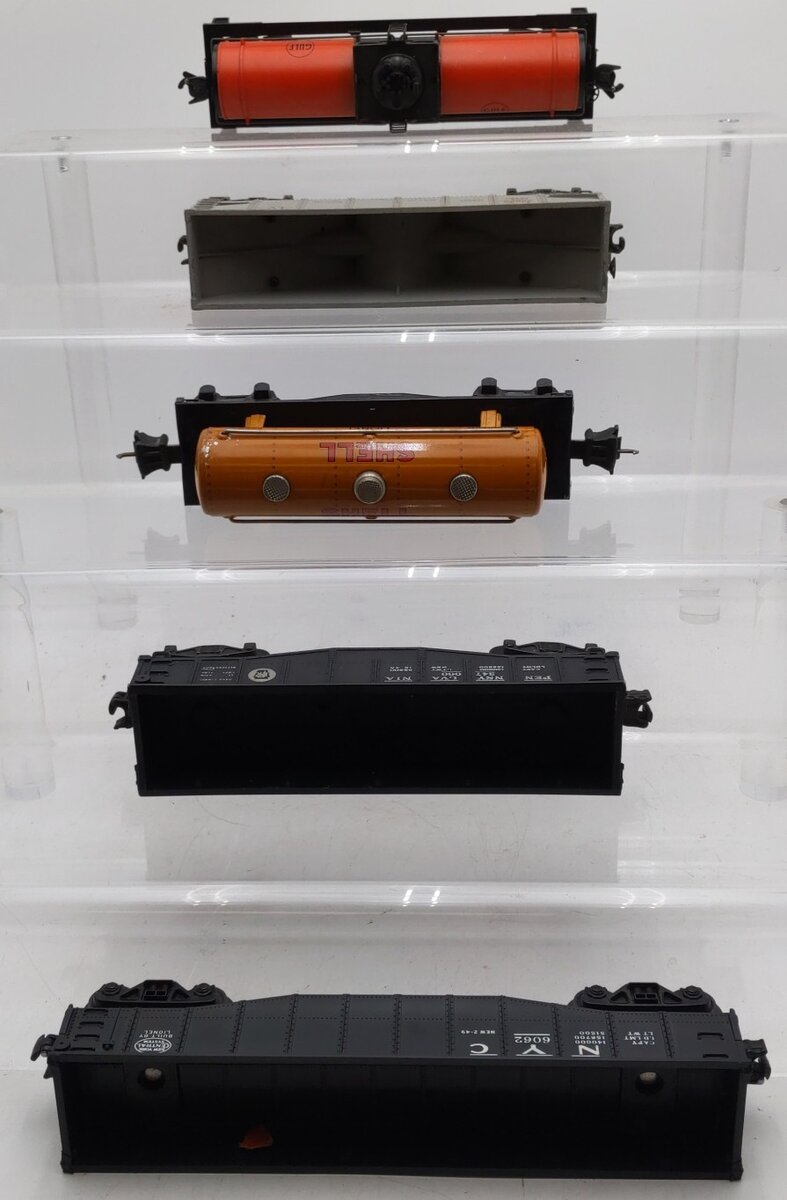 Here are 5 Lionel Vintage O Gauge Assorted Freight Cars - #6062,6315,25000,2680,347000. Features include plastic and tin construction, plastic and metal trucks, metal wheels and axles, and knuckle and box couplers.