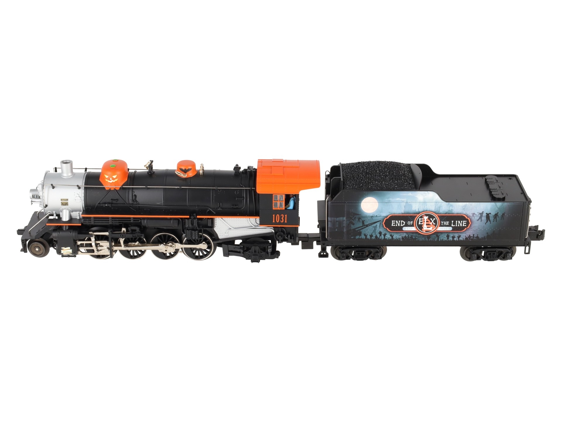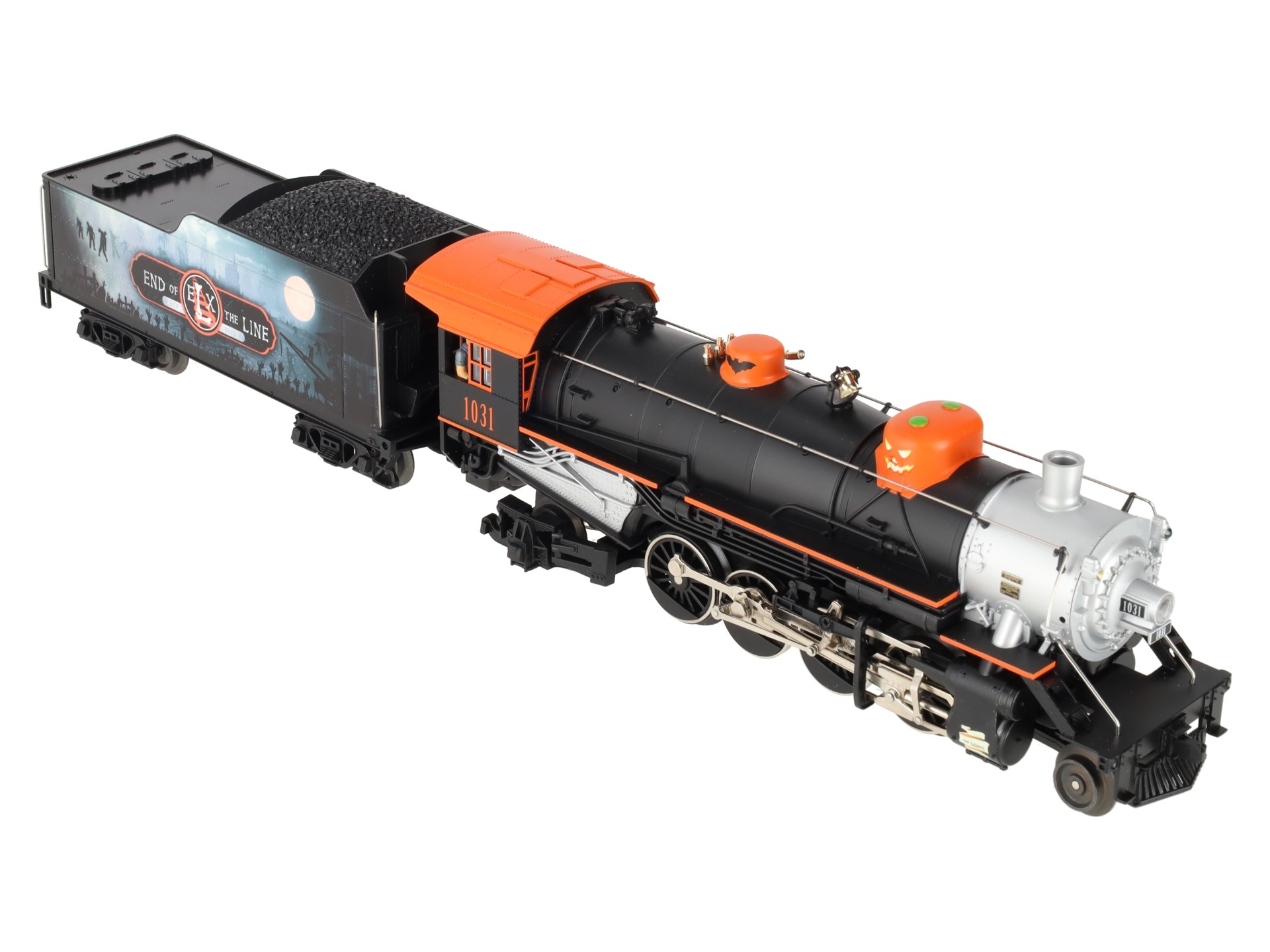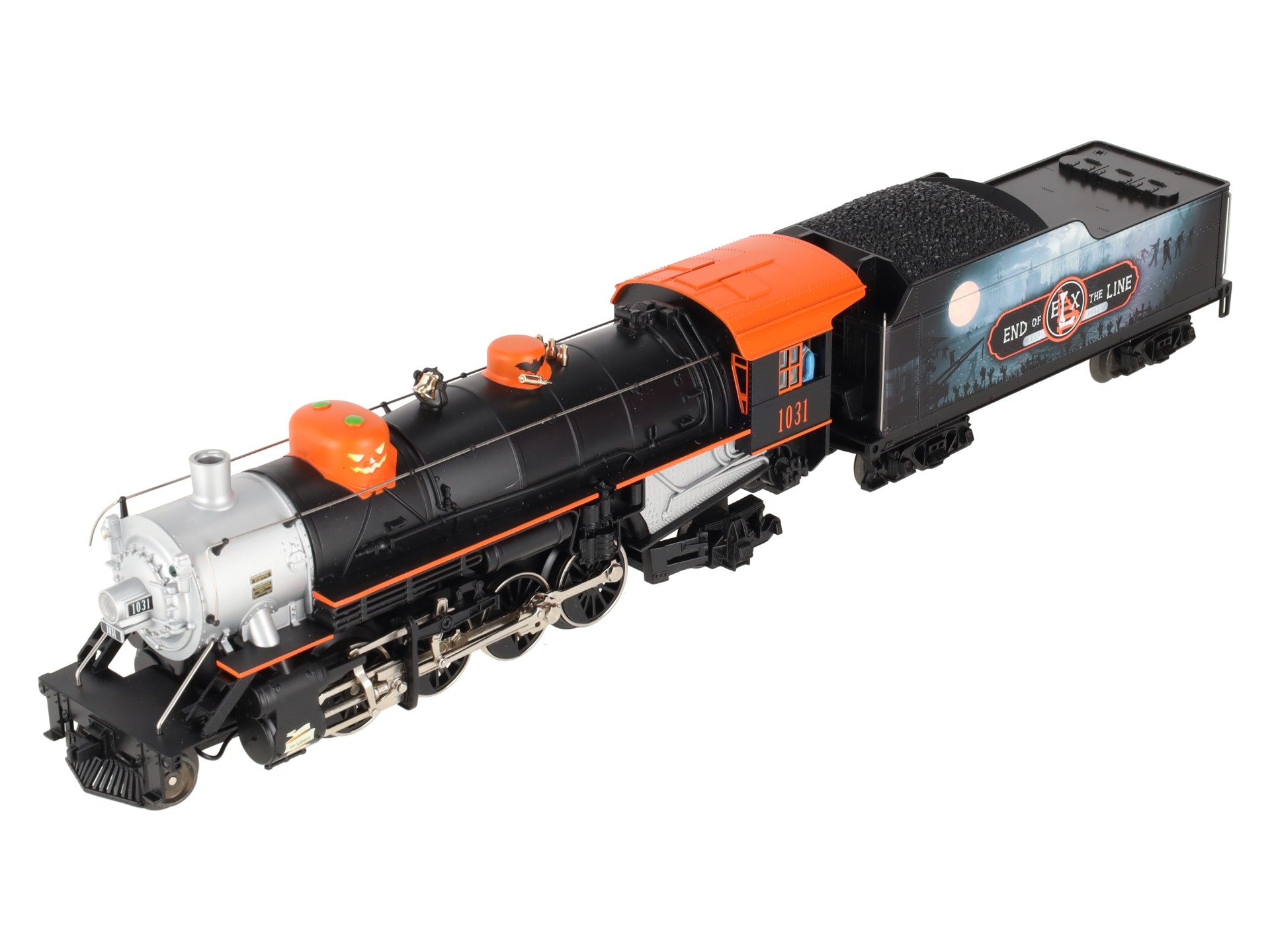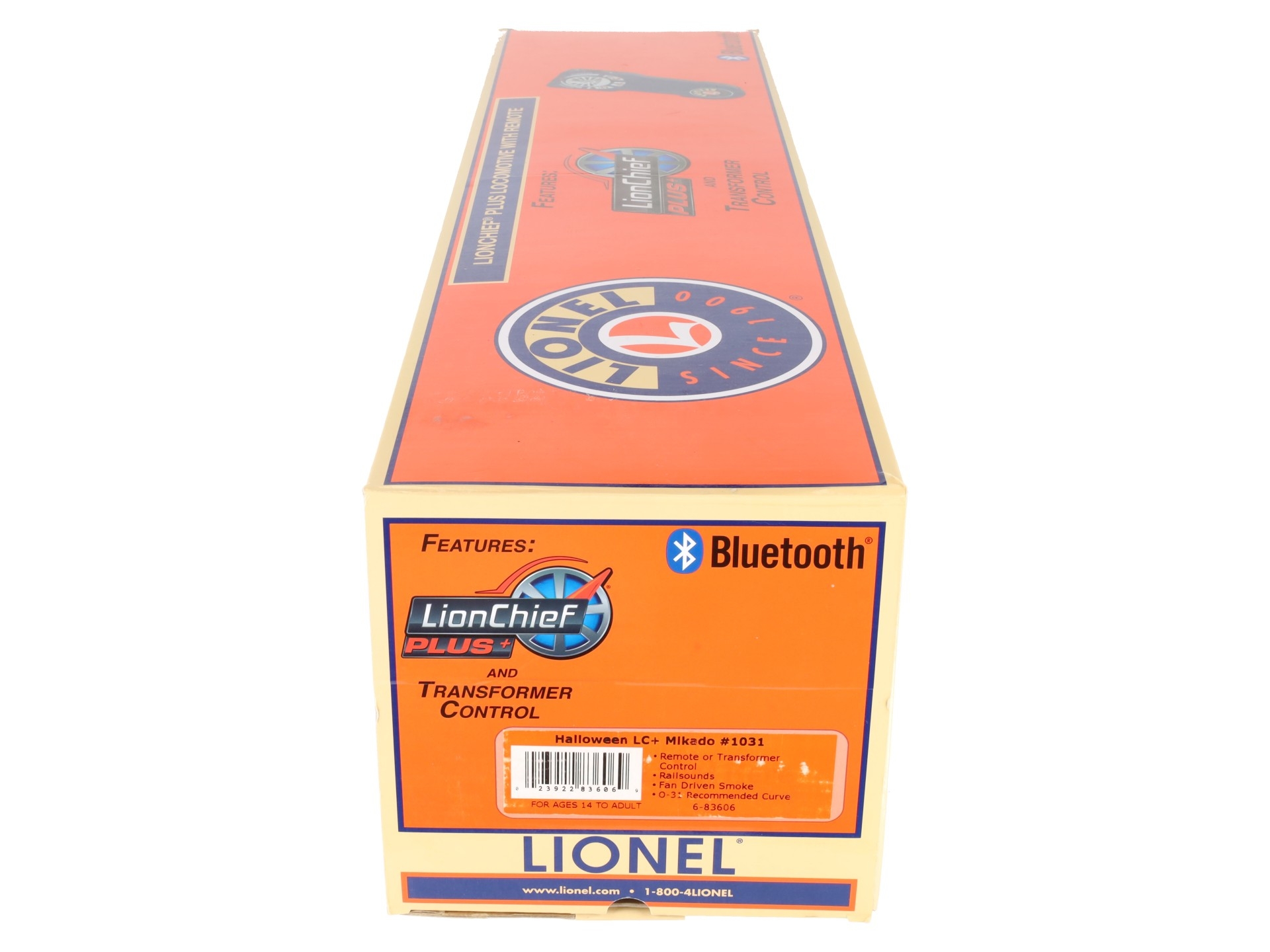 This is a Lionel 6-83606 O Scale Halloween LionChief Plus 2-8-2 Mikado Steam Loco. LionChief® Plus Steam Locomotives Features: Conventional AC transformer control mode or LionChief® wireless remote control with AC or DC power, ElectroCoupler™ on rear of tender (controlled by remote only), A5 0-4-0 equipped with ElectroCoupler™ on front as well as rear of tender, Operating headlight, Synchronized fan driven smoke, On/Off switches for sound and smoke, RailSounds RC™ sound system with steam chuffing and background sounds, whistle, bell, and user-activated announcements, Adjustable volume (controlled by remote only), Speed control for consistent speed at all ranges regardless of track condition or load, Flickering firebox, Chuffing sounds in sync with puffing smoke, Powerful maintenance-free motor, Die-cast metal locomotive body, frame, and trucks, Die-cast metal tender body and trucks, Metal frame on tender, Engineer and fireman figures, Traction tires, Length: Camelback 17 1/2 Mikado, Pacific and Hudson 19, Minimum Curve: O31. LionChief® Plus Remote Features: Forward and reverse speed control knob, Buttons for whistle sound, bell, special announcements and ElectroCoupler™ activation and Requires three AAA alkaline batteries.