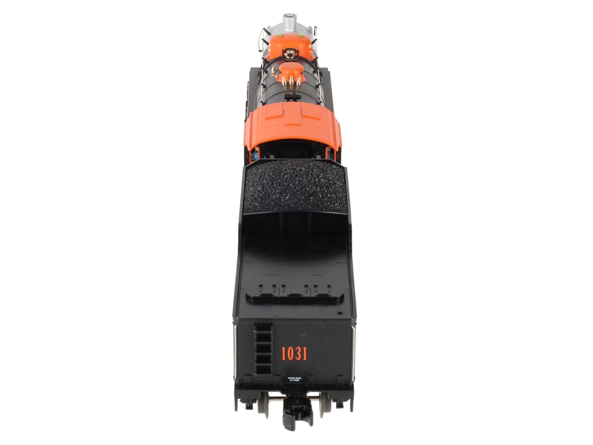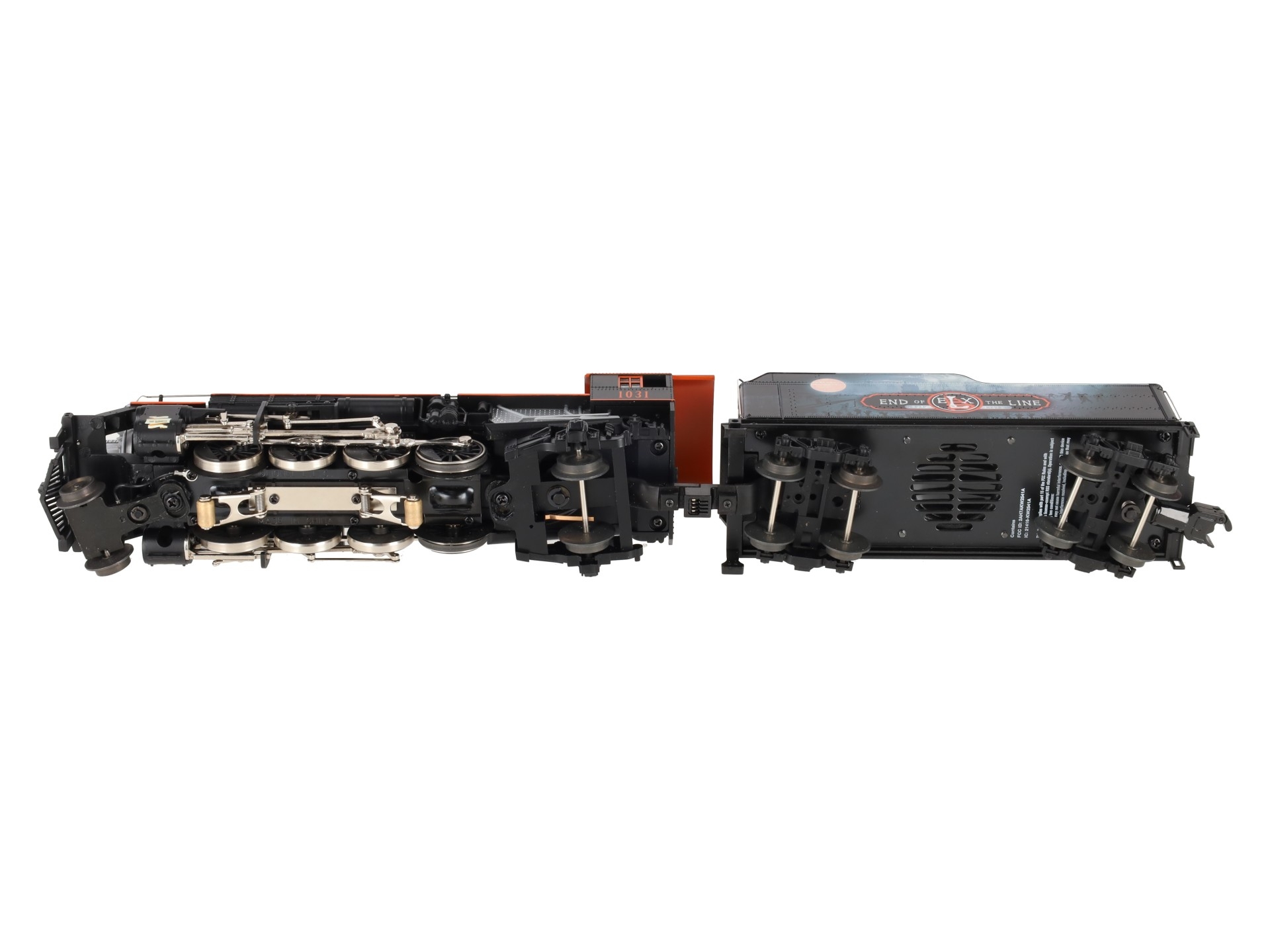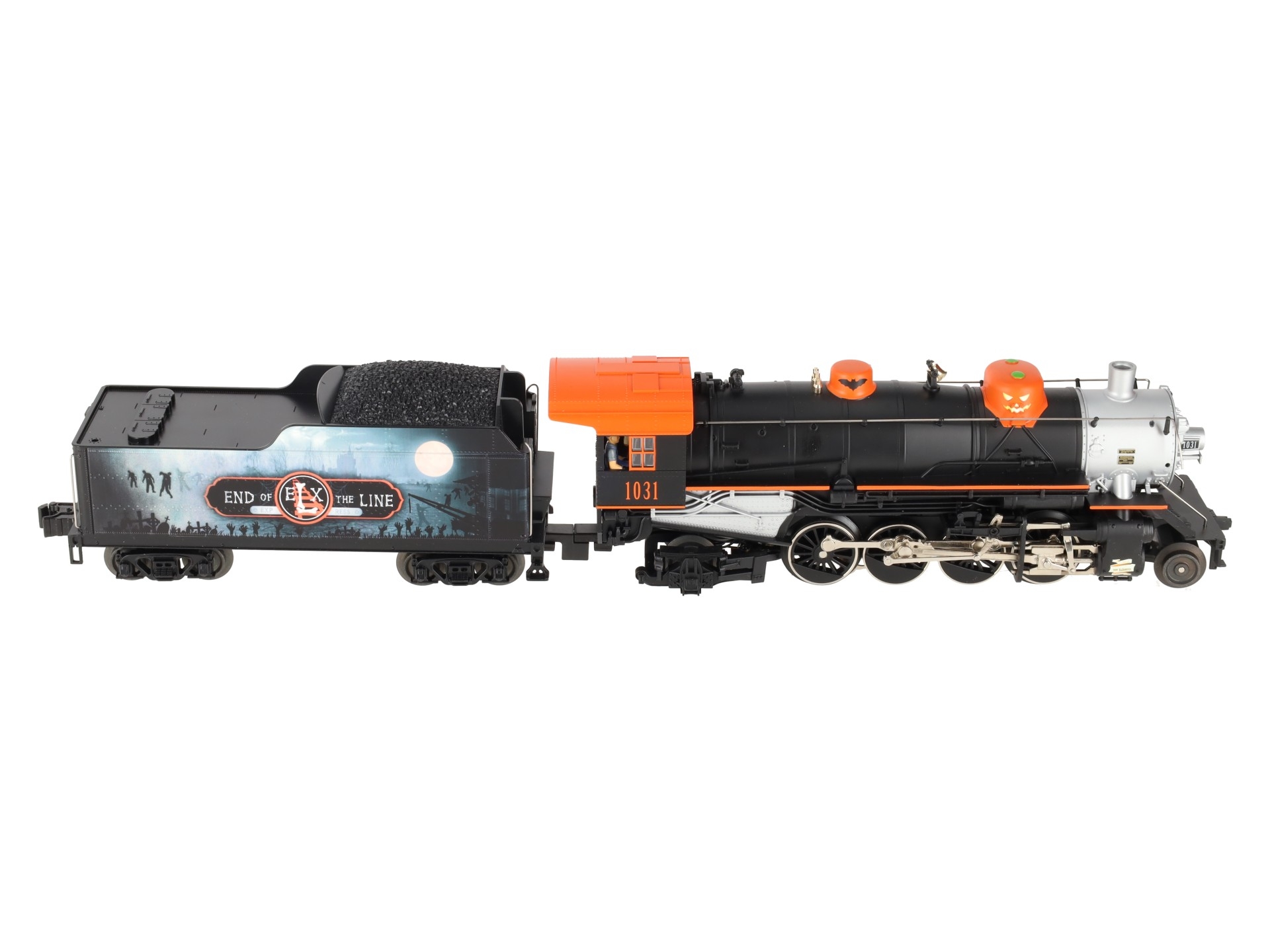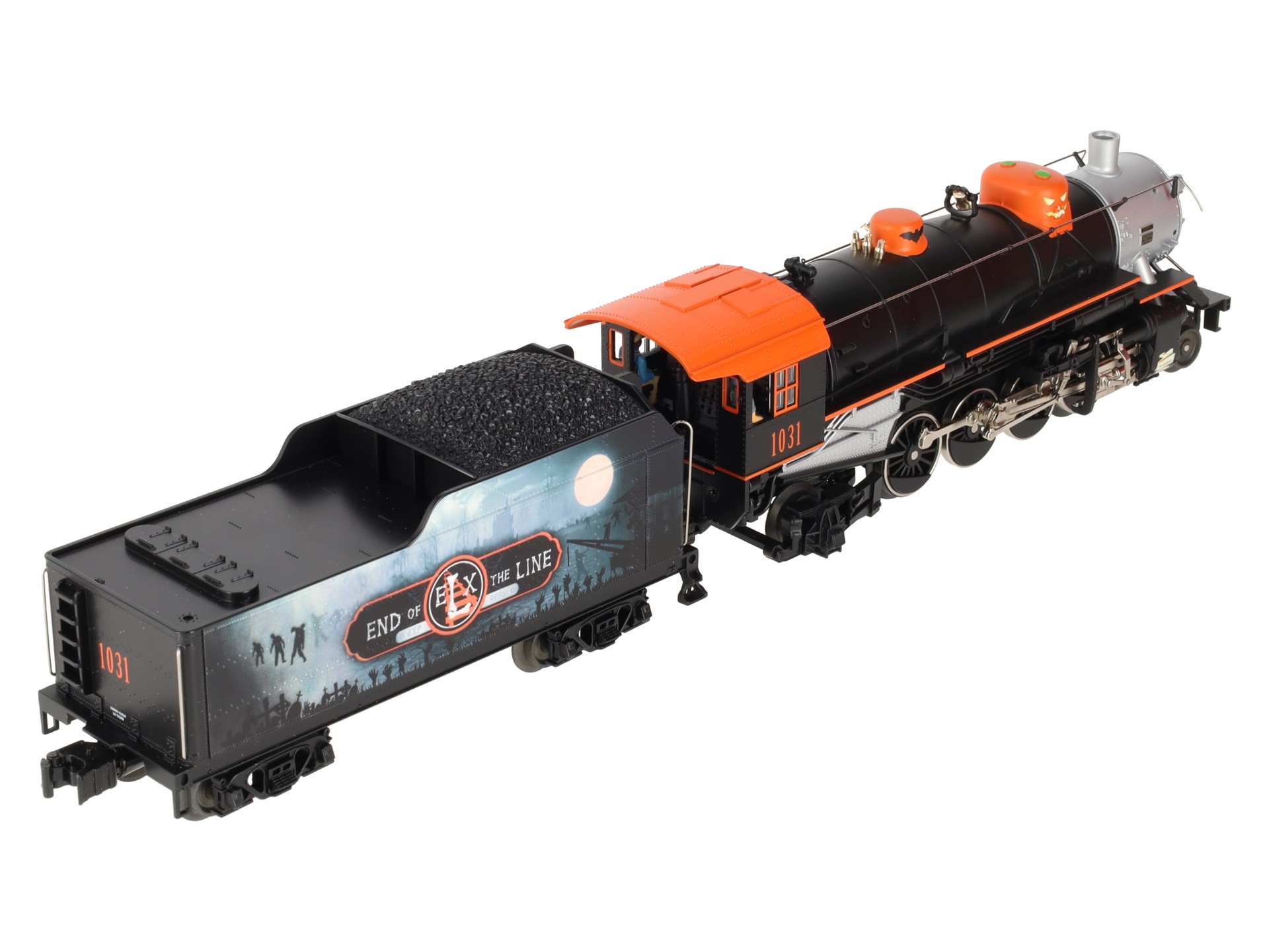 This is a Lionel 6-83606 O Scale Halloween LionChief Plus 2-8-2 Mikado Steam Loco. LionChief® Plus Steam Locomotives Features: Conventional AC transformer control mode or LionChief® wireless remote control with AC or DC power, ElectroCoupler™ on rear of tender (controlled by remote only), A5 0-4-0 equipped with ElectroCoupler™ on front as well as rear of tender, Operating headlight, Synchronized fan driven smoke, On/Off switches for sound and smoke, RailSounds RC™ sound system with steam chuffing and background sounds, whistle, bell, and user-activated announcements, Adjustable volume (controlled by remote only), Speed control for consistent speed at all ranges regardless of track condition or load, Flickering firebox, Chuffing sounds in sync with puffing smoke, Powerful maintenance-free motor, Die-cast metal locomotive body, frame, and trucks, Die-cast metal tender body and trucks, Metal frame on tender, Engineer and fireman figures, Traction tires, Length: Camelback 17 1/2 Mikado, Pacific and Hudson 19, Minimum Curve: O31. LionChief® Plus Remote Features: Forward and reverse speed control knob, Buttons for whistle sound, bell, special announcements and ElectroCoupler™ activation and Requires three AAA alkaline batteries.