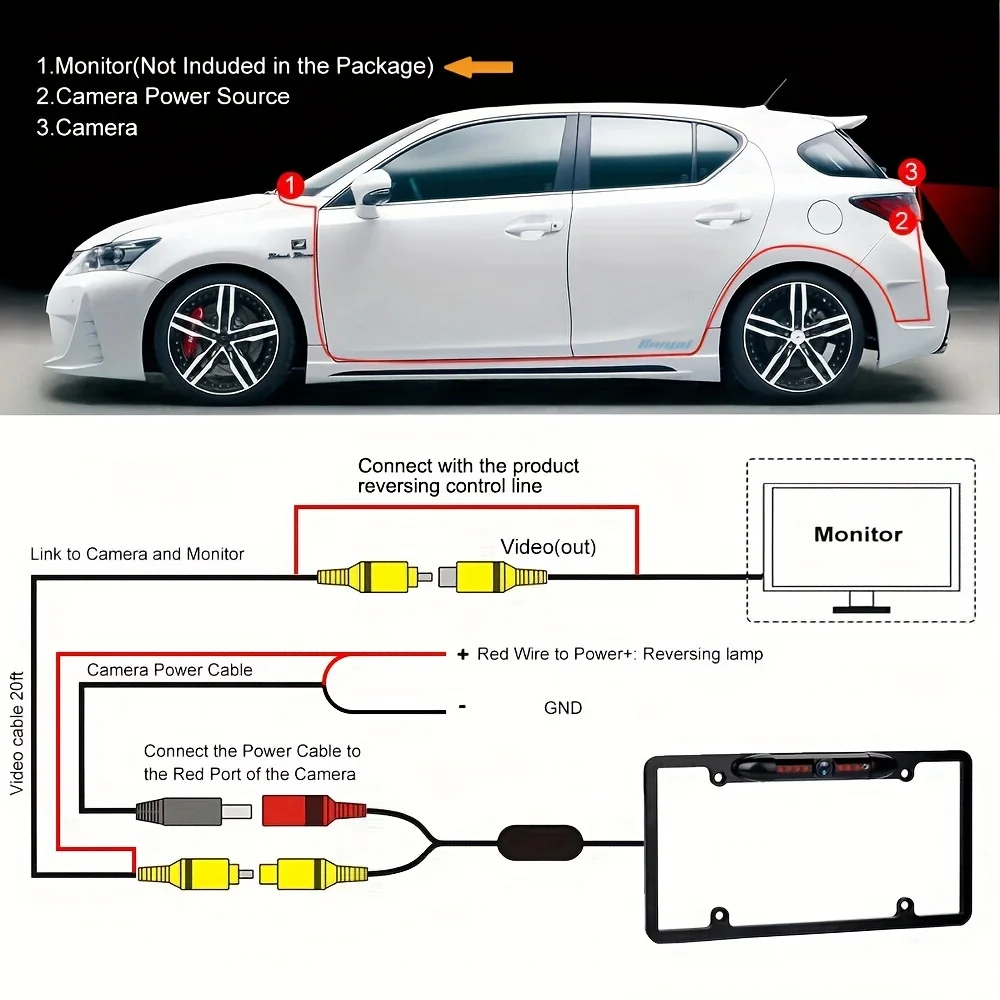 License Plate Camera Resolution: 800TV Line Lens Material: Glass Power supply: DC12V Signal System: NTSC Resolution:510×496 Lens view angle: 120 degrees Image Sensors: 1/3 HD CCD Parking line:No parking line Minimum lighting: 0.1Lux Features: Waterproof Dynamic Range: >60dB Package Included 1 x License Plate Camera 1 x 6M Extension Cable 1 x Camera power cable 1 x Screws