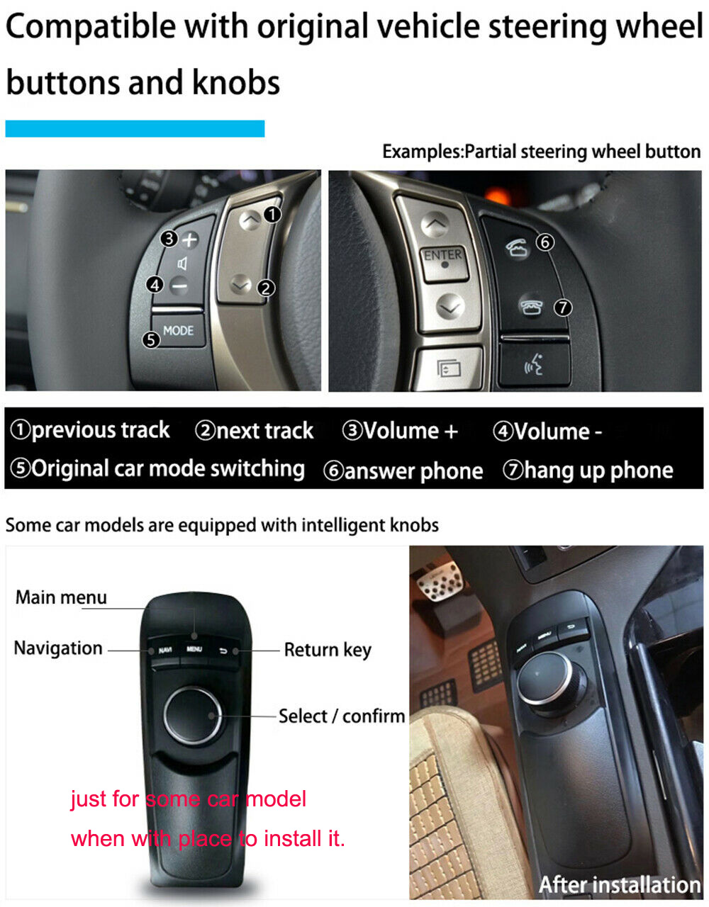 1. Be compatible with cars with original screen 2.0/4.3/6.5/7.0/8.0/8.4 inch.