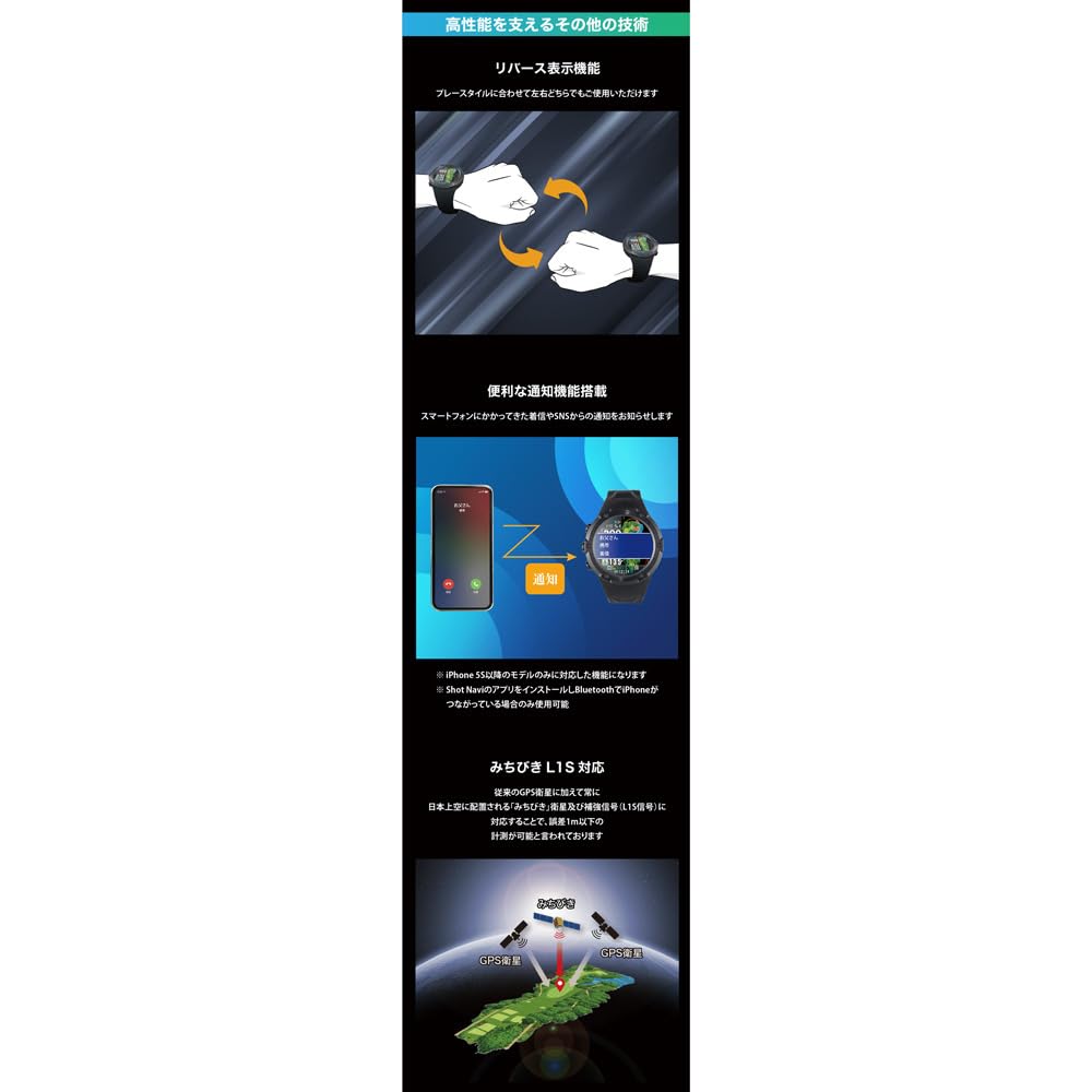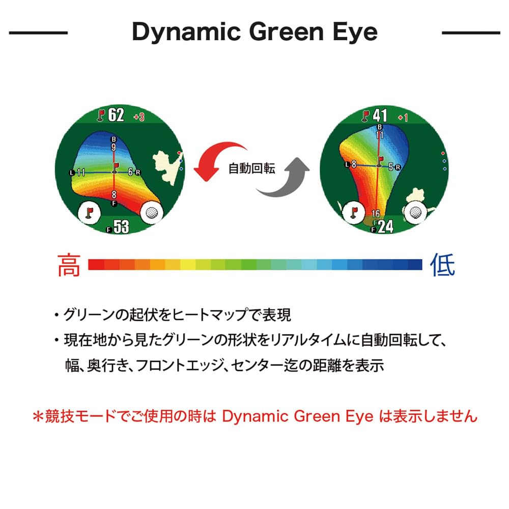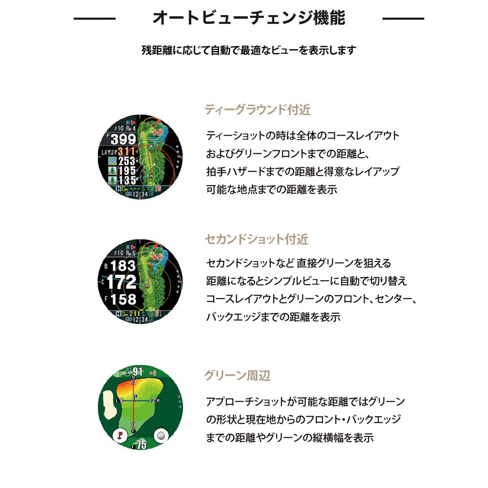 [Intuitive operation with the industry's largest 1.4 inch touch panel] Vertical and horizontal swipes and touch operations dramatically improve operation during play. ■ [New function "Dynamic Green Eye"] Displays the undulations of the green on a heat map. The shape of the green as seen from the current location is automatically rotated in real time, and the width, depth, front edge, and distance to the center are also displayed at the same time. ■ [Auto measure (automatic distance measurement)] Automatically detects your swing and measures and records the distance you fly on your behalf. ■ [Auto view change] Automatically displays the optimal view according to the remaining distance. During tee shots, second shots, and approaches. *You can also switch by manually swiping up and down. ■ [Elevation difference guideline distance] In addition to the measured straight-line distance, the actual guideline distance to hit is automatically calculated and displayed, taking into account the elevation difference (uphill, downhill).