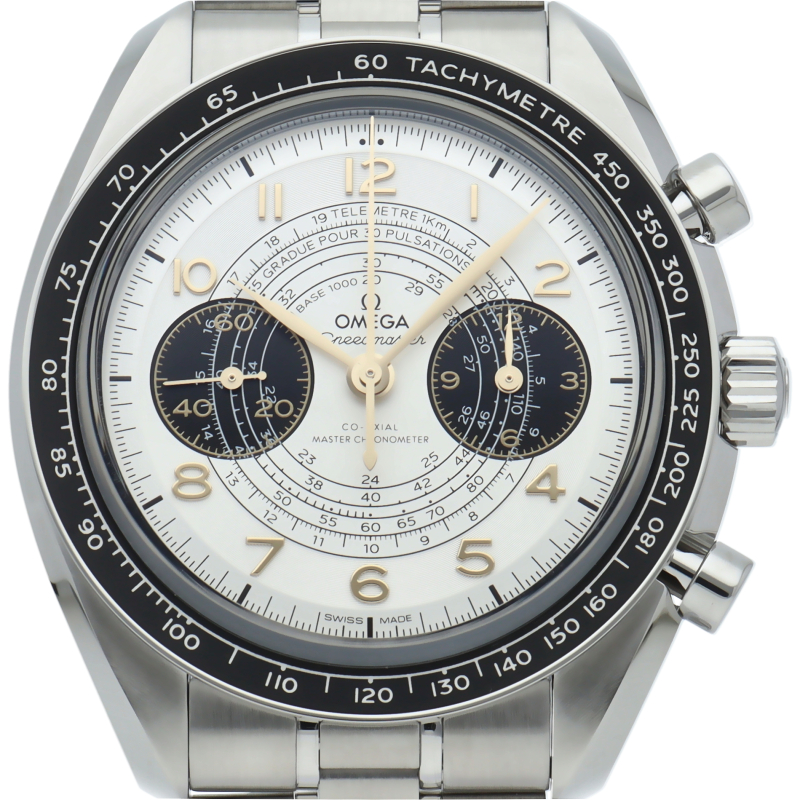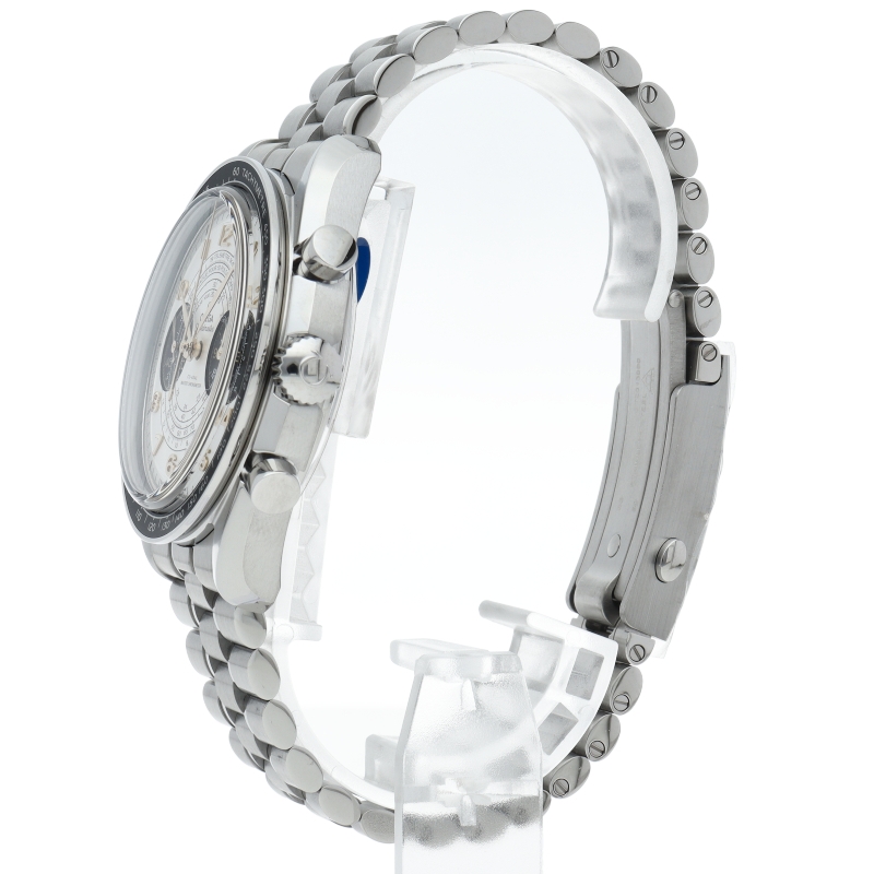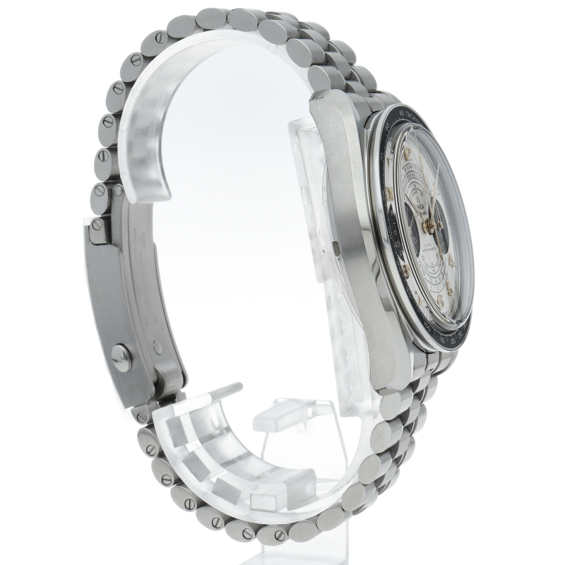| The Chronoscope collection combines the legendary design of the Speedmaster with inspiration from OMEGA's history of chronograph watches dating back to the 1940s. In the center of the dial, the tachymeter, pulsometer, and telemeter are printed using the snail design of the 1940s, creating a unique, classic atmosphere never before seen in a Speedmaster. |