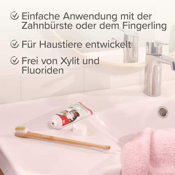 Eine kleine Menge Zahnpasta auf Zahnbürste oder Zahnfingerling geben und die Zähne vorsichtig reinigen. Langsam an die Anwendung gewöhnen. Frisches Trinkwasser bereitstellen.