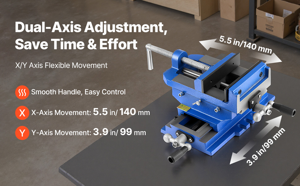 Precise Positioning: Designed for X/Y axis movement, this drill press vise creates greater operating space and flexibility. With a 5.5 in (140 mm) X-axis movement and 3.9 in (99 mm) Y-axis movement, it ensures accurate workpiece positioning in tasks
