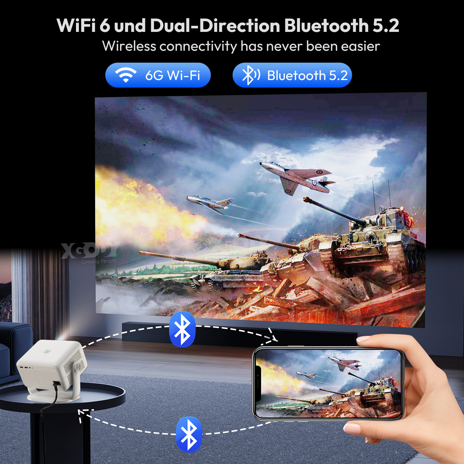 ăWiFi 6 connection & Bluetooth 5.2ăThe Wi-Fi projector with Wi-Fi 6 and Bluetooth 5.2 supports dual-band Wi-Fi. Whether you're watching a high-definition movie, listening to high-quality music, or playing games, speed and stability are guaranteed.