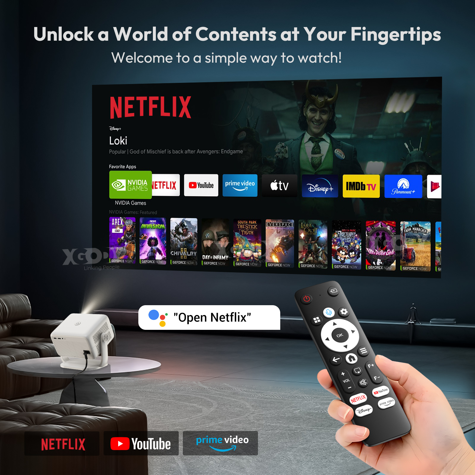 đșăOfficially-Licensed NetfIix Projector | Whale Os| ăXGODY N6 smart 4K projector is preloaded with officially licensed NetfIix, Prime Video and Youtube. With just one click, we could reach over 1,000,000 FHD videos. Moreover, we could download our favorite apps in the 'APP STORE'. No need to fuss with connecting other devices like TV stick. P.S: for all other projectors which claimed Whale Os projectors, they need to be connected with extra devices to watch official Netflix videos.