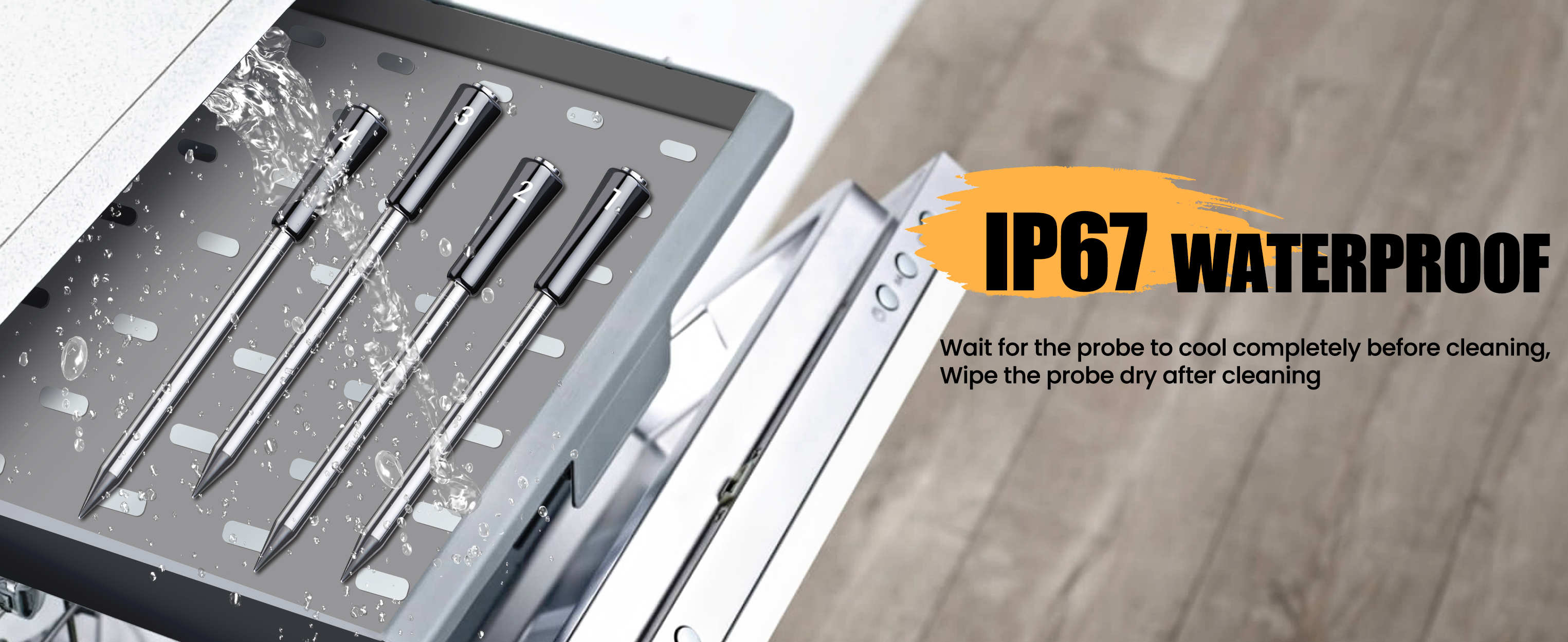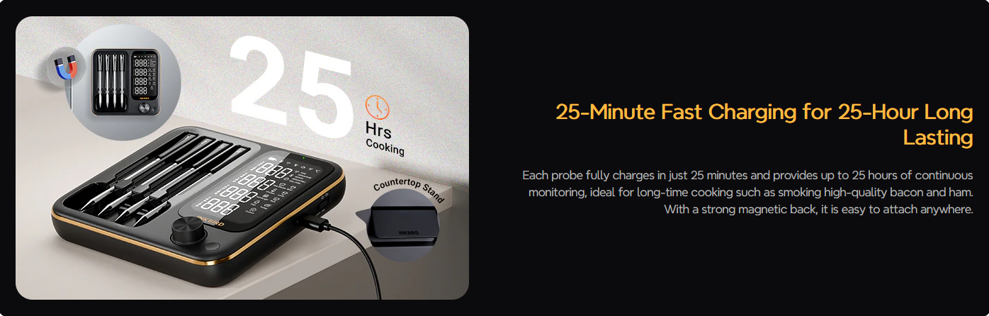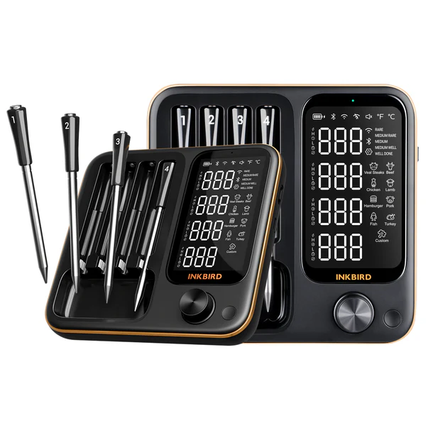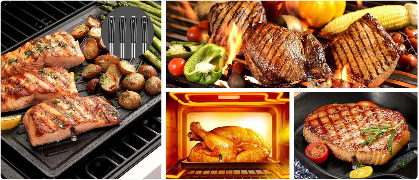 **4 Probes Digital Food Cooking Meat Thermometer with 2.24*4 Inches Full-viewing Angle Backlit LCD Screen.The unit can save 30 miniutes cooking data even without phone connection.The high-definition LCD screen on the charging stand clearly displays the current temperature of each probe at the same time. 4 probes suit for cooking, grilling and frying, multiple food preparation at the same time, multiple delicacies to enjoy at the same time.