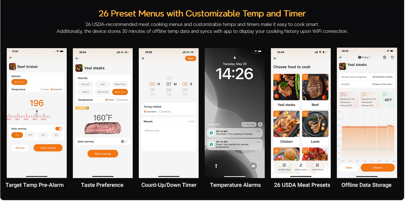 The app includes 26 meat menus with USDA-recommended cooking temperatures, making it easy to create a cooking program.