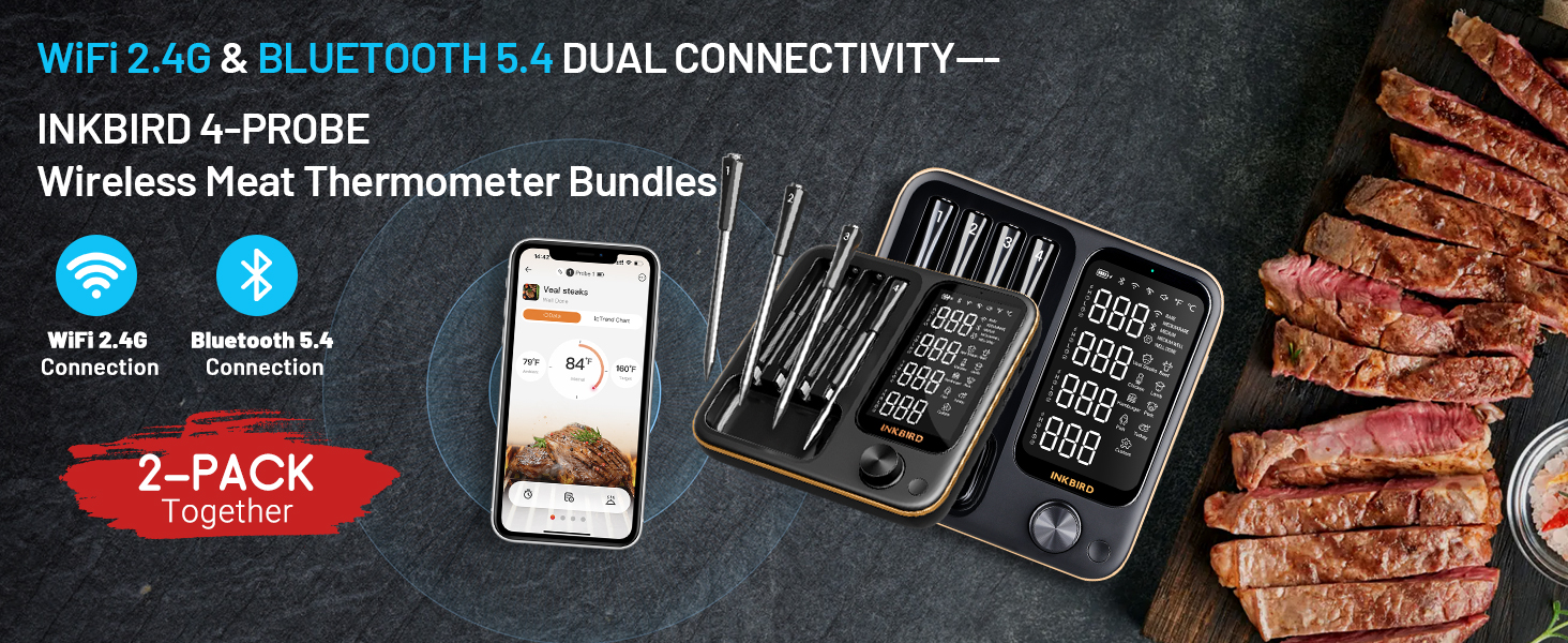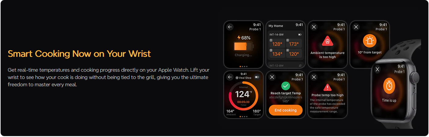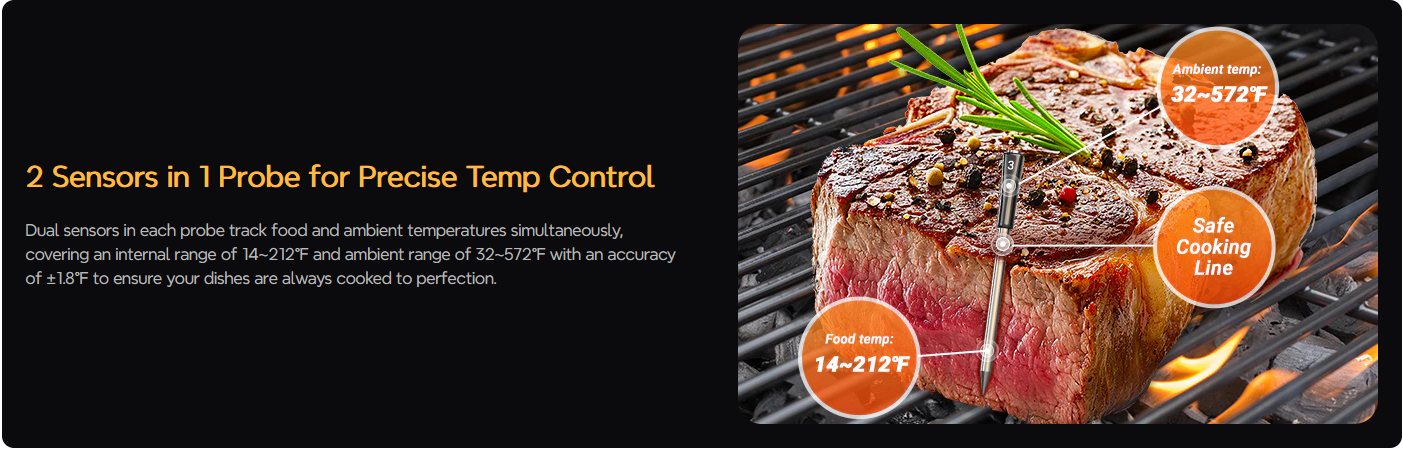 **Monitor Anywhere with WiFi : Built-in advanced WiFi 5 G+2.4 G and Bluetooth 5.4 modules to enable high-speed and stable remote control; monitor the cooking progress via Bluetooth at home within 328 ft, and switch to WiFi connection in outdoor for a seamless monitoring experience.