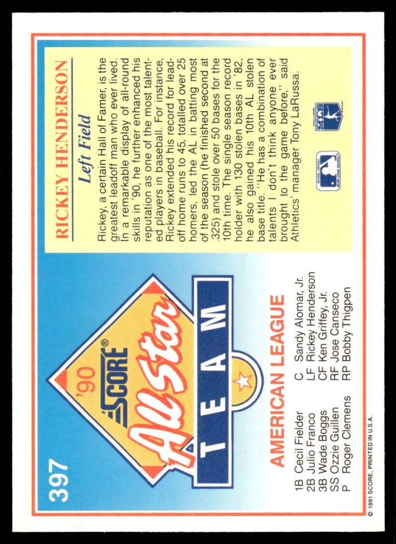 | 1991 Score Rickey Henderson Oakland Athletics #397 |