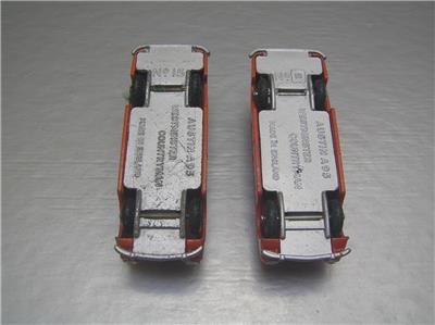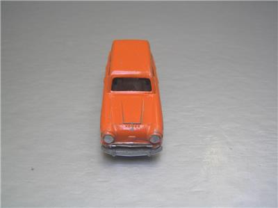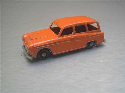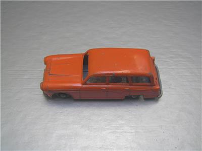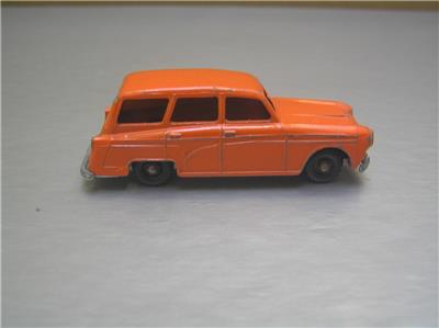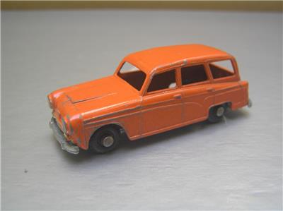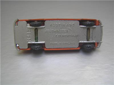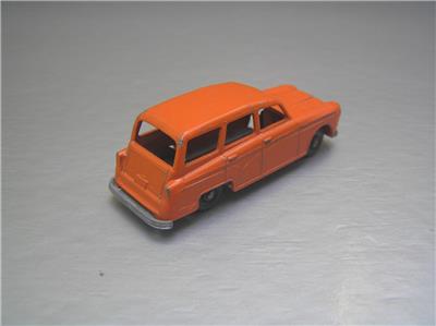 This is a Budgie Toys #15 made in England in 1960s. The scale is roughly 1/66 scale. The variation has black plastic wheels and true orange color and more common type base. You can compare with the more reddish variation in last side to side photos, this one it the one on the left.