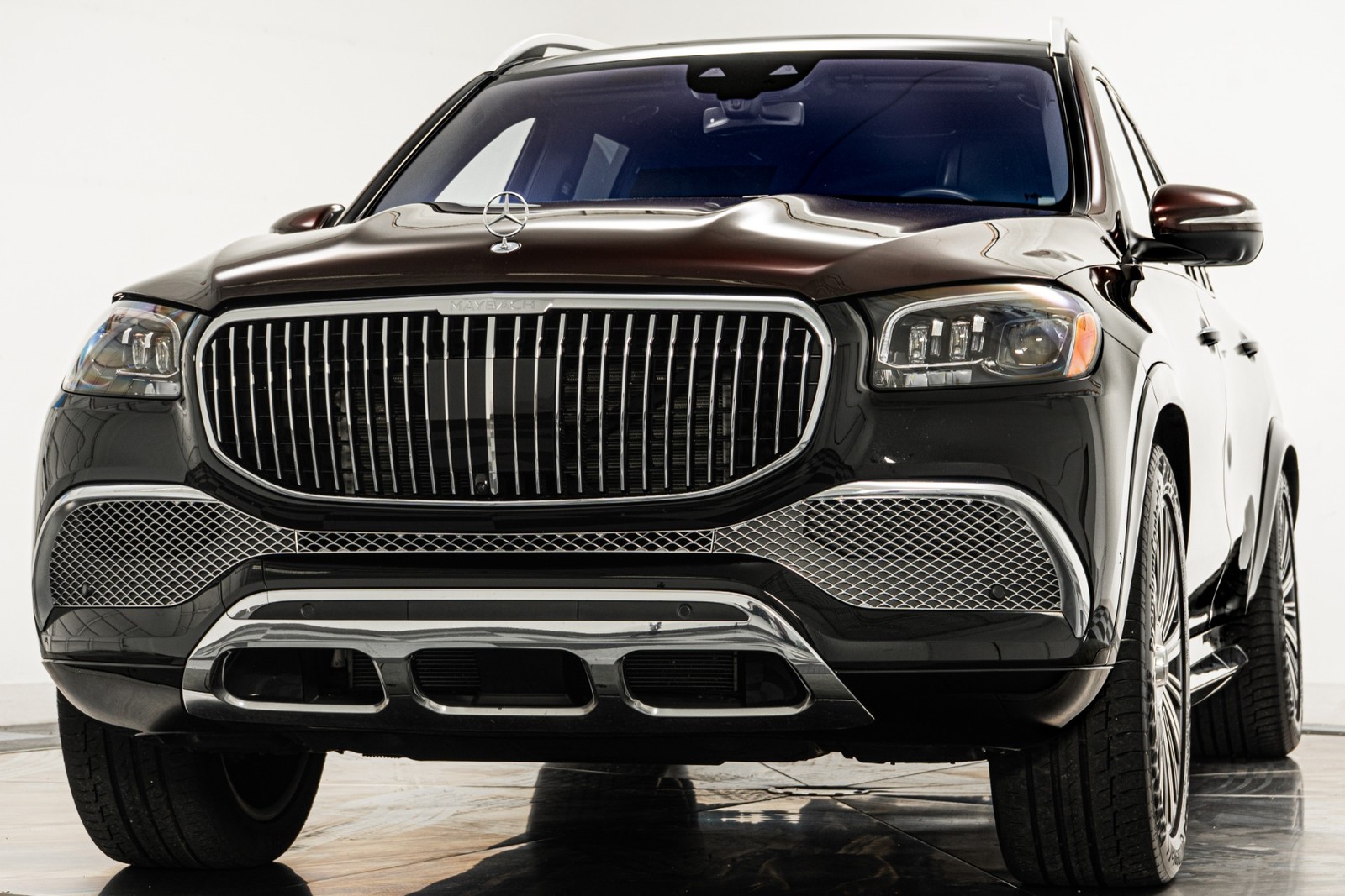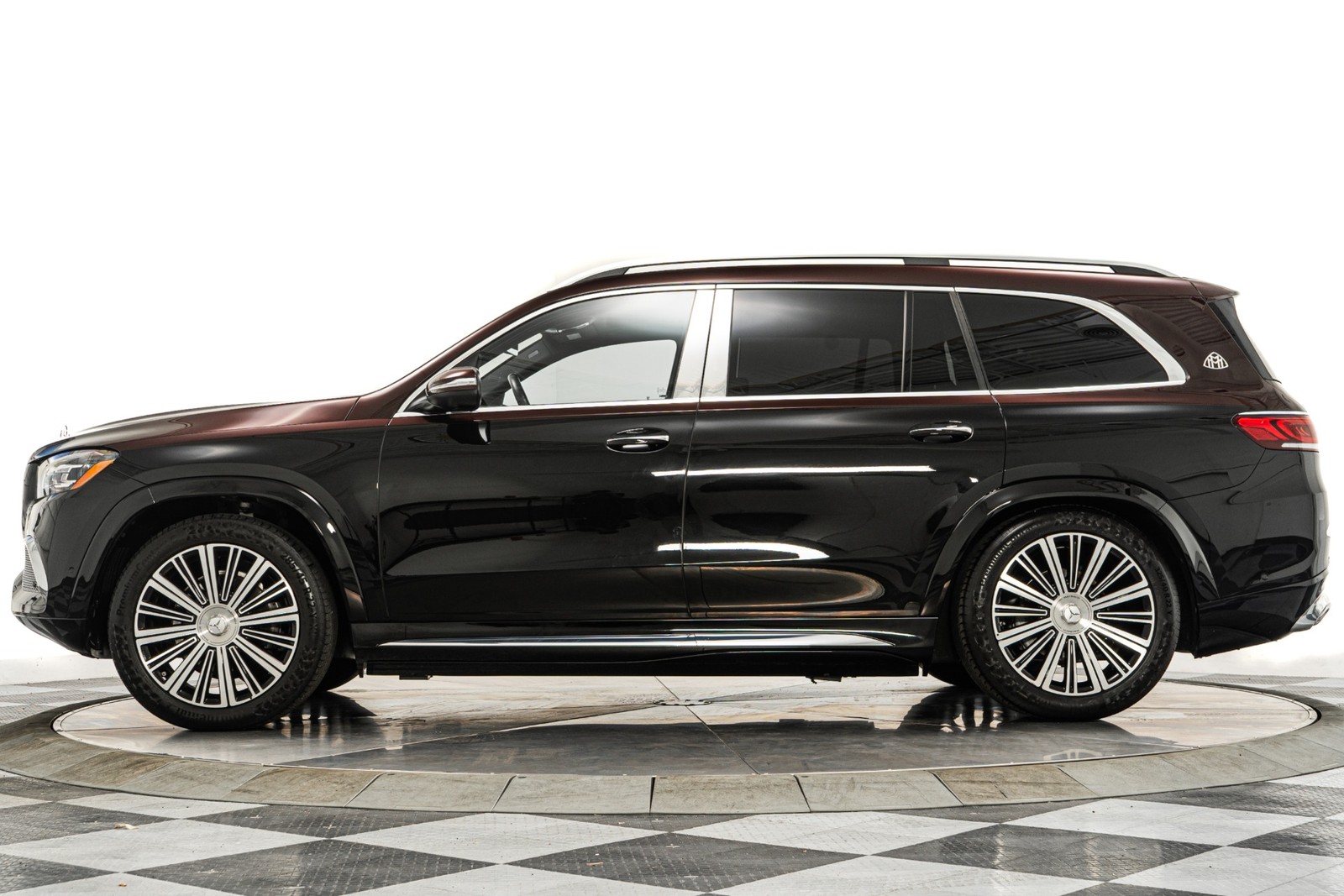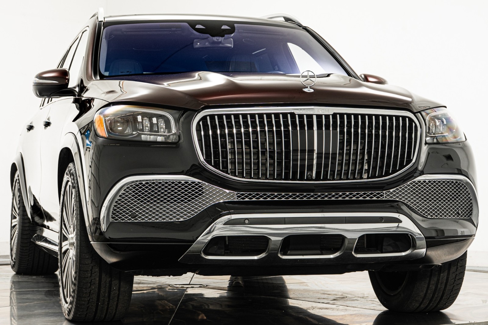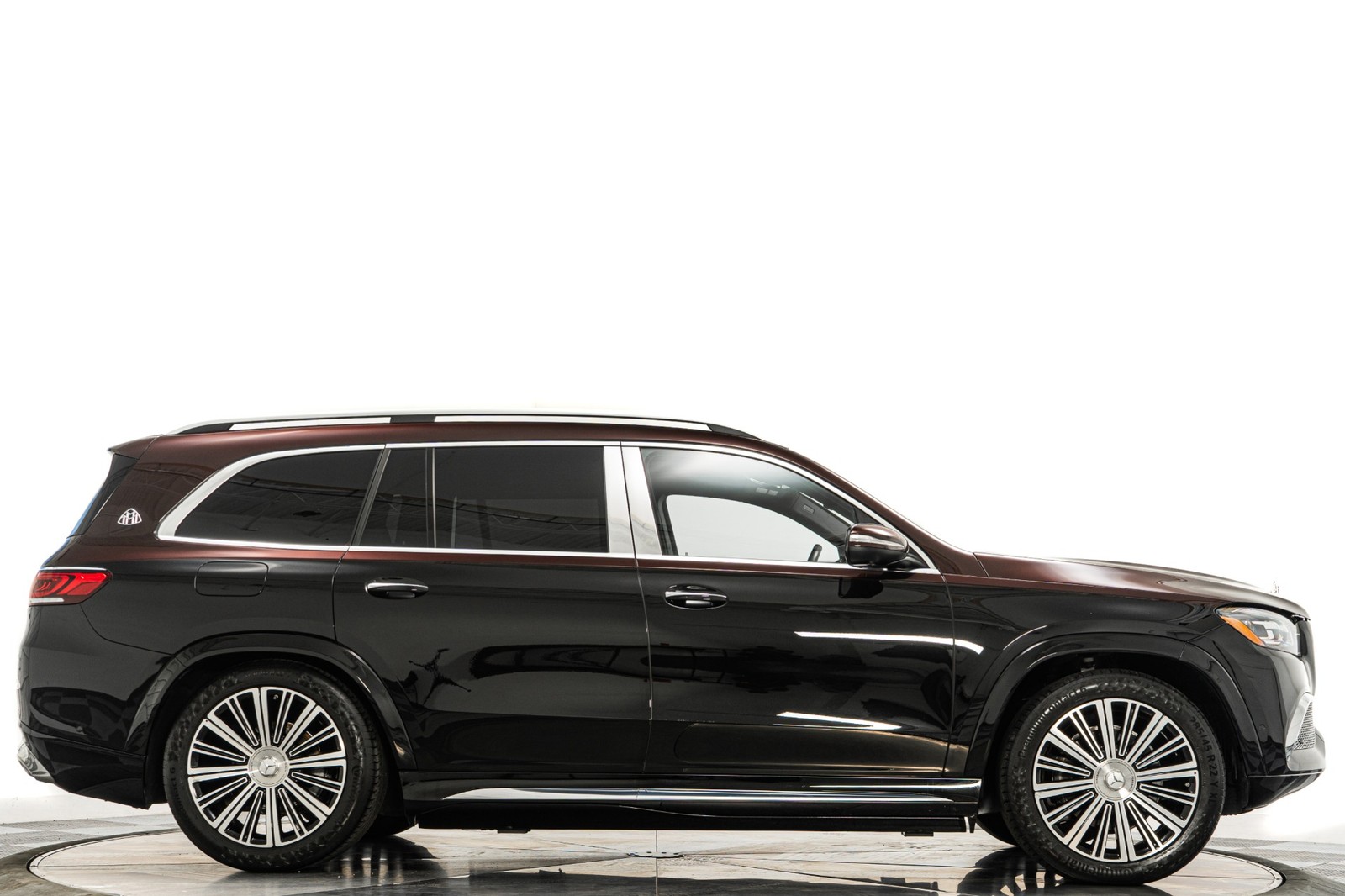 2023 Mercedes-Benz Maybach GLS 600 in Obsidian Black and Rubelite Red Metallic over Black leather interior with only 19,771 miles. This Maybach GLS 600 is loaded with: 4.0L Biturbo V8 with 550hp, 9 speed automatic transmission, diamond turned 22 inch Maybach multi spoke forged wheels with black inlays, power deployable running boards, reclining rear outboard seats, panoramic roof, natural grain black-flamed ash wood interior trim, heated and ventilated front and rear seats, Burmester audio, Distronic cruise control, lane departure warning, blind spot detection, floor mats and much more.
