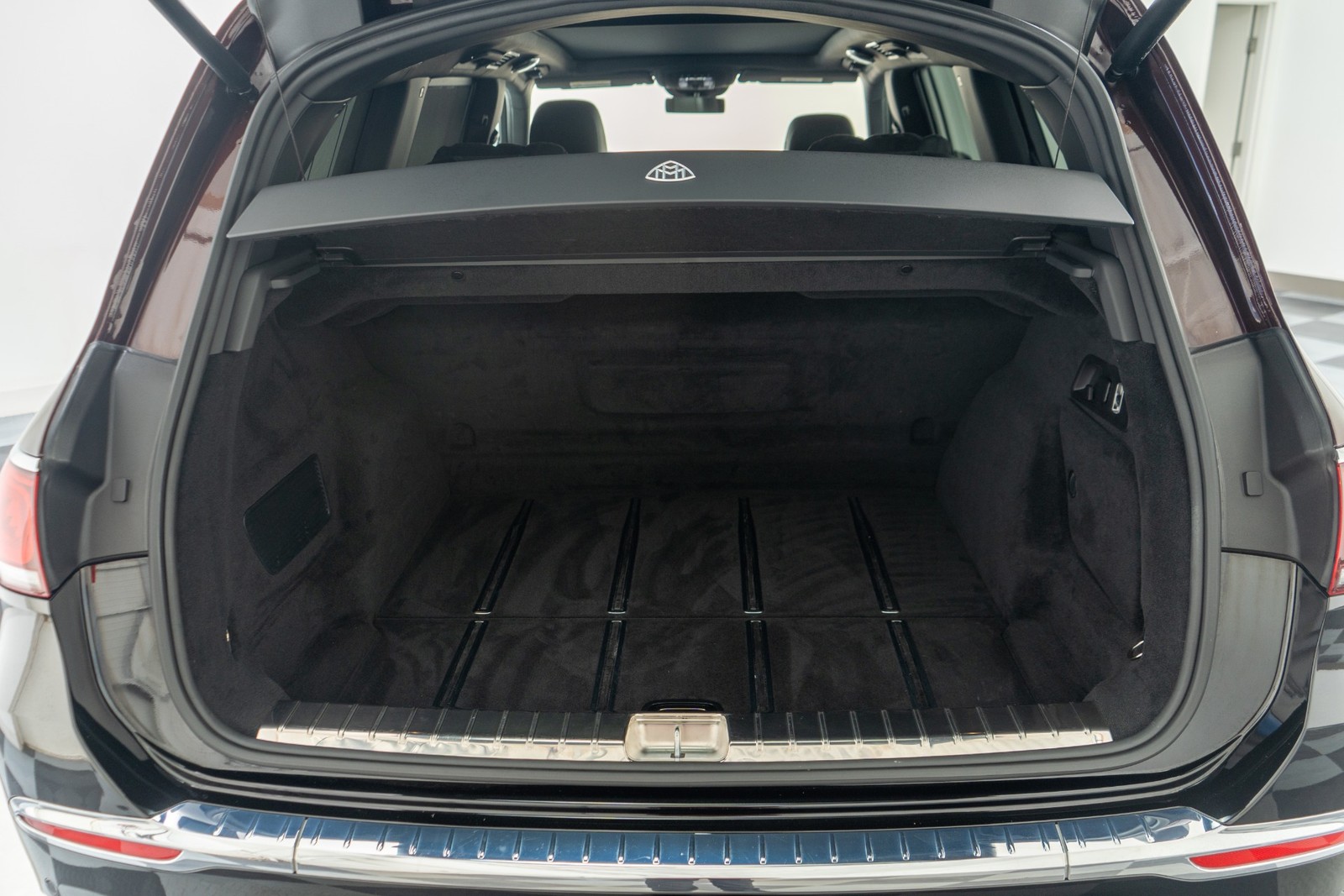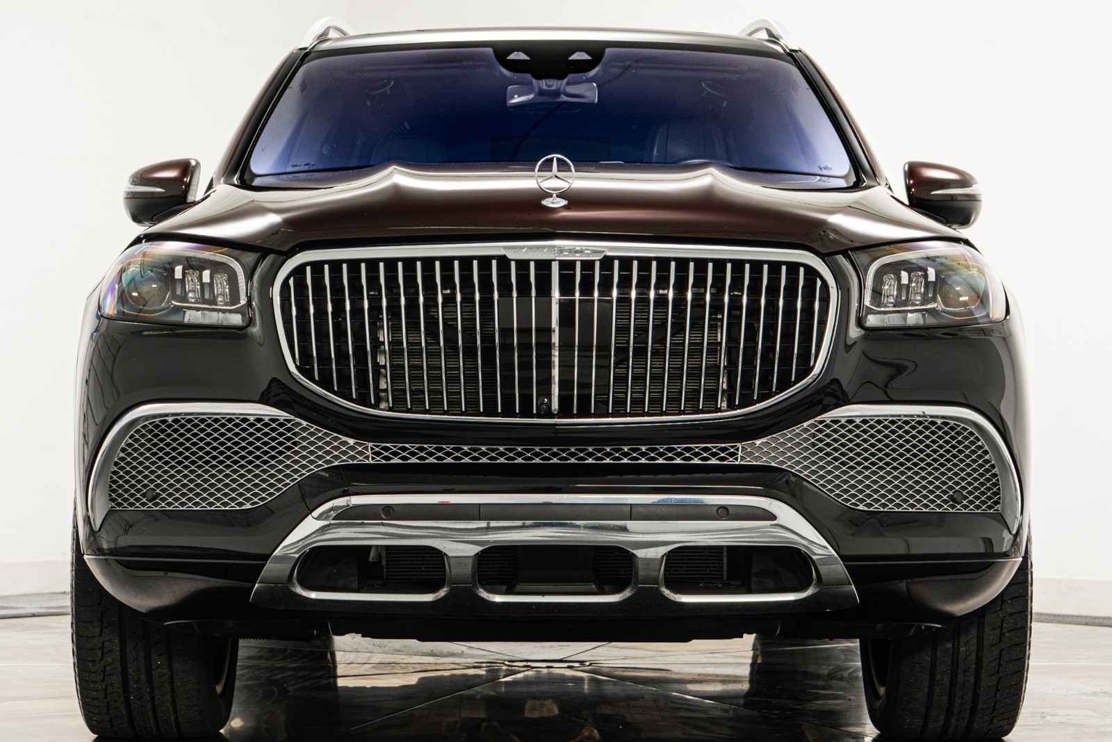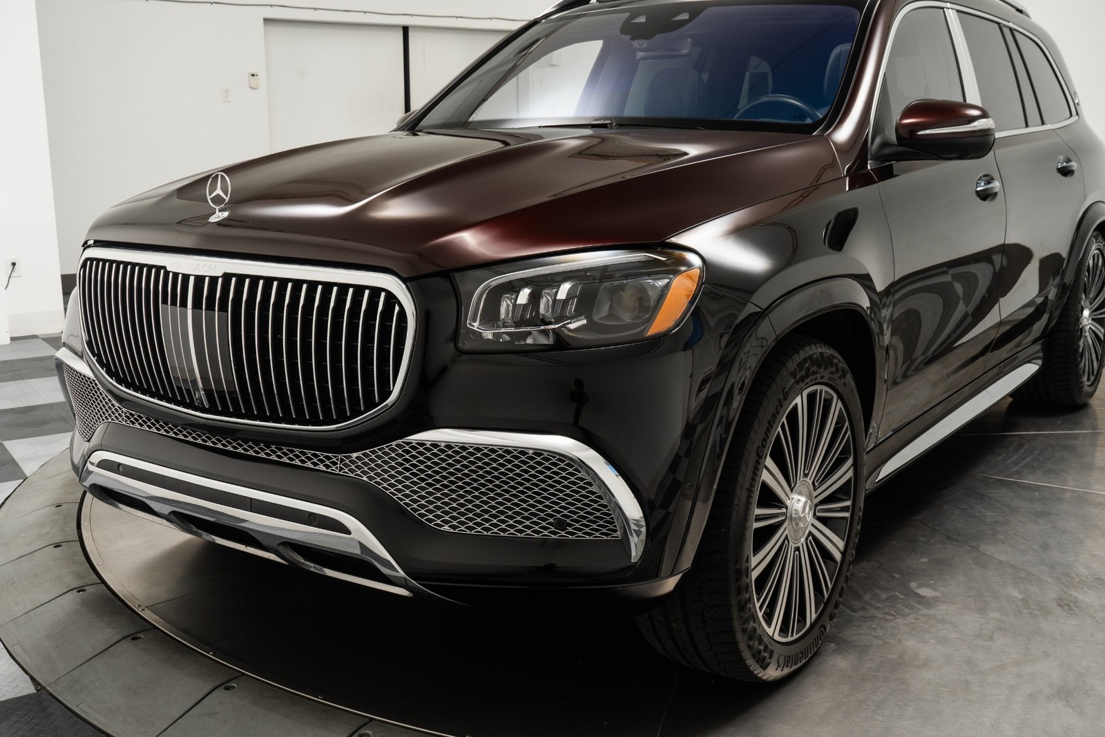 2023 Mercedes-Benz Maybach GLS 600 in Obsidian Black and Rubelite Red Metallic over Black leather interior with only 19,771 miles. This Maybach GLS 600 is loaded with: 4.0L Biturbo V8 with 550hp, 9 speed automatic transmission, diamond turned 22 inch Maybach multi spoke forged wheels with black inlays, power deployable running boards, reclining rear outboard seats, panoramic roof, natural grain black-flamed ash wood interior trim, heated and ventilated front and rear seats, Burmester audio, Distronic cruise control, lane departure warning, blind spot detection, floor mats and much more.