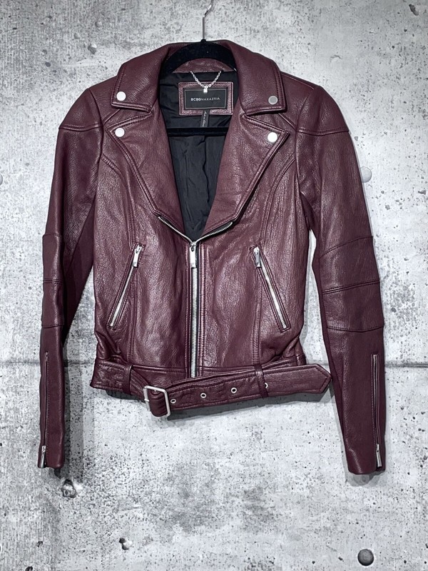 BCBG Miley Leather Moto Jacket! This beauty is in excellent like new condition. No flaws or wear to note. This jacket is lined and has secured exterior pockets with stretchy ribbed underarm panels for movement. No longer in stores. Retailed for a lot. Size XXS. Please check the measurements below to ensure a proper fit. Measurements were taken while item was laying flat. All of my items come from a smoke-free home.