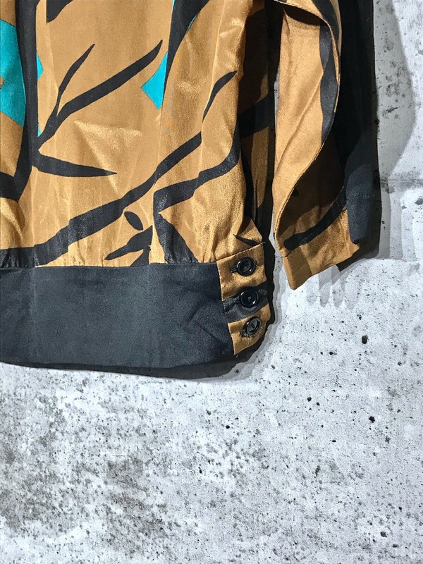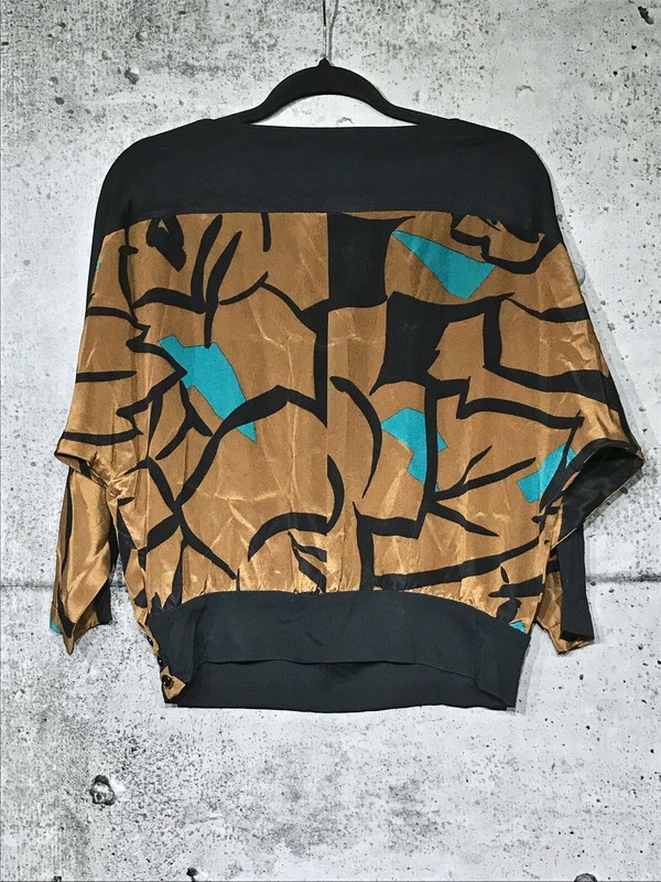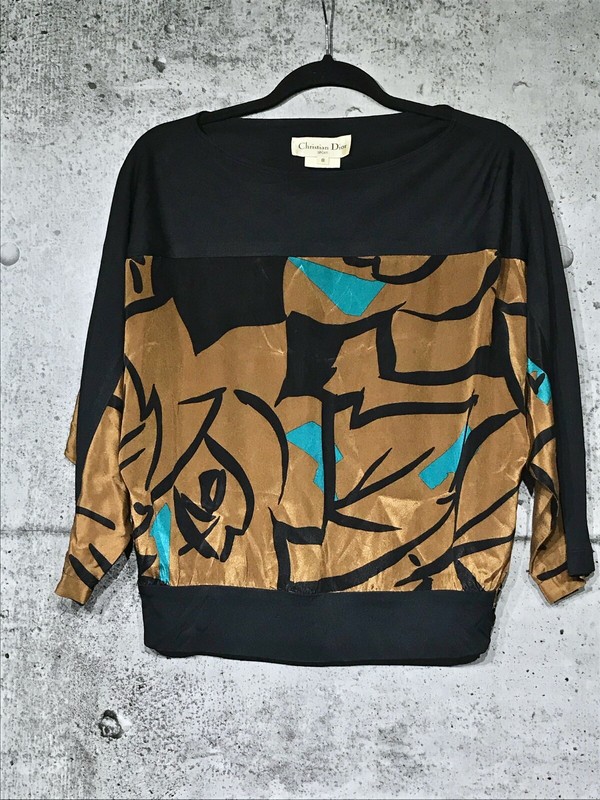 This gorgeous, vintage Christian Dior silk popover is in excellent condition especially for it’s age. No flaws to note. The solid black portions of the top are made with a polyester like fabric and the printed fabric is silk. It has batwing sleeve and a tapered waist that has buttons on the side. No longer available in stores. Size 8. Please check the measurements below to ensure a proper fit. Measurements are taken while item is laying flat. All of my items come from a smoke-free home.