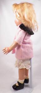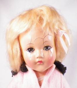 - Gorgeous coloring/Blue sleep eyes with hair eyelashes. Blonde mohair wig. 15" tall