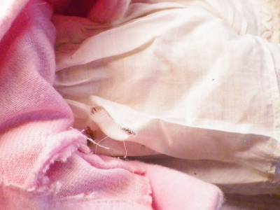 - Don't know if clothes are original but they are of the era. Yellowing & a tear on the undergarment
