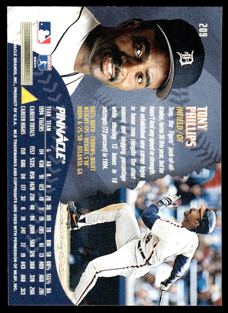 | Description: | Tony Phillips | | Category: | Baseball | | Year: | 1995 | | Product: | Pinnacle | | Card Number: | 209 | | Dimensions: | 3½" x 2½" | | SKU: | BL B0009 R01 P (15) |
