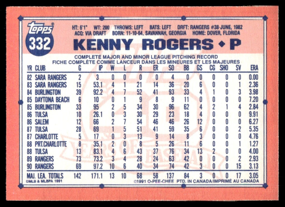 | 1991 O-Pee-Chee Kenny Rogers Texas Rangers #332 |