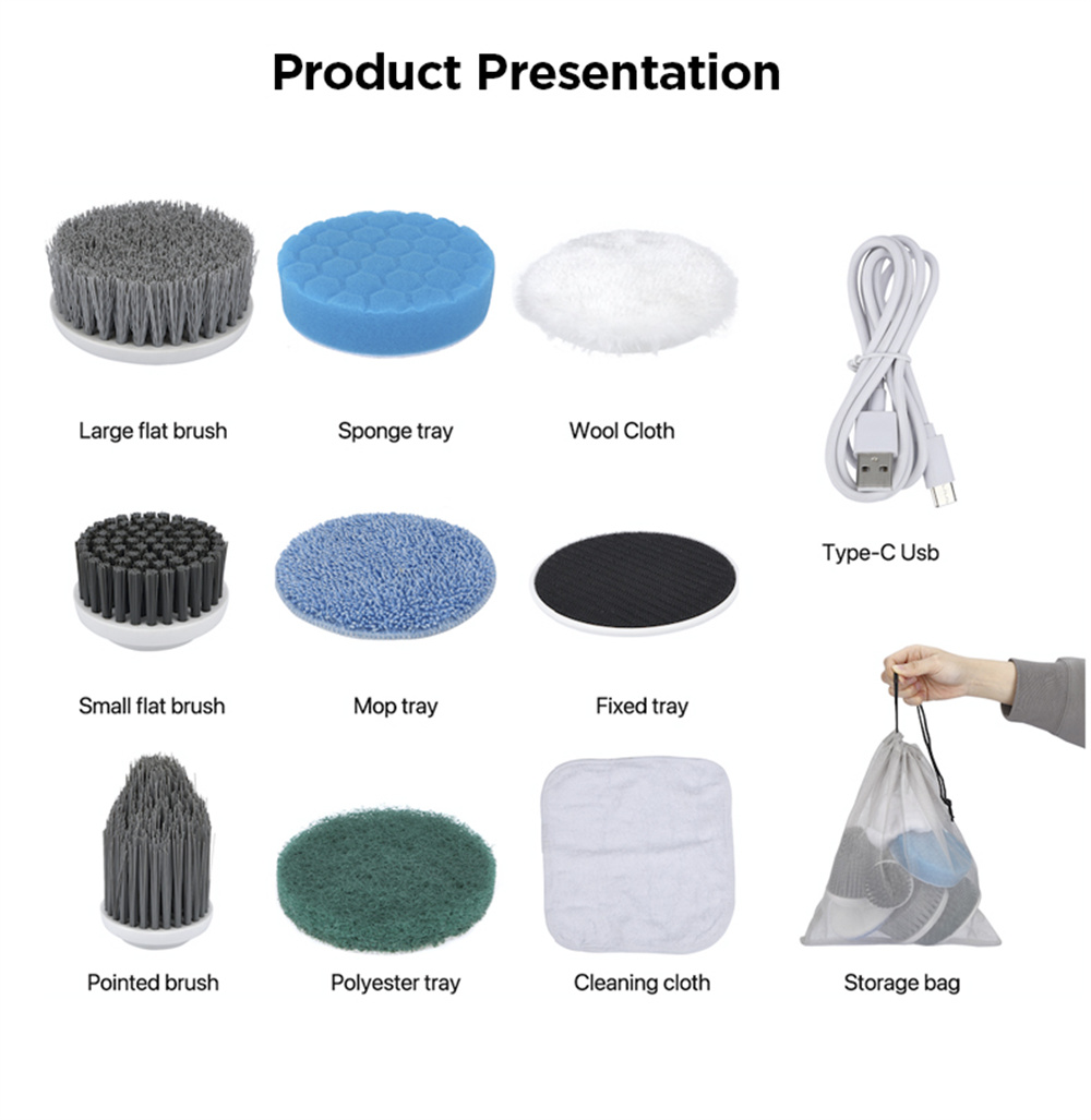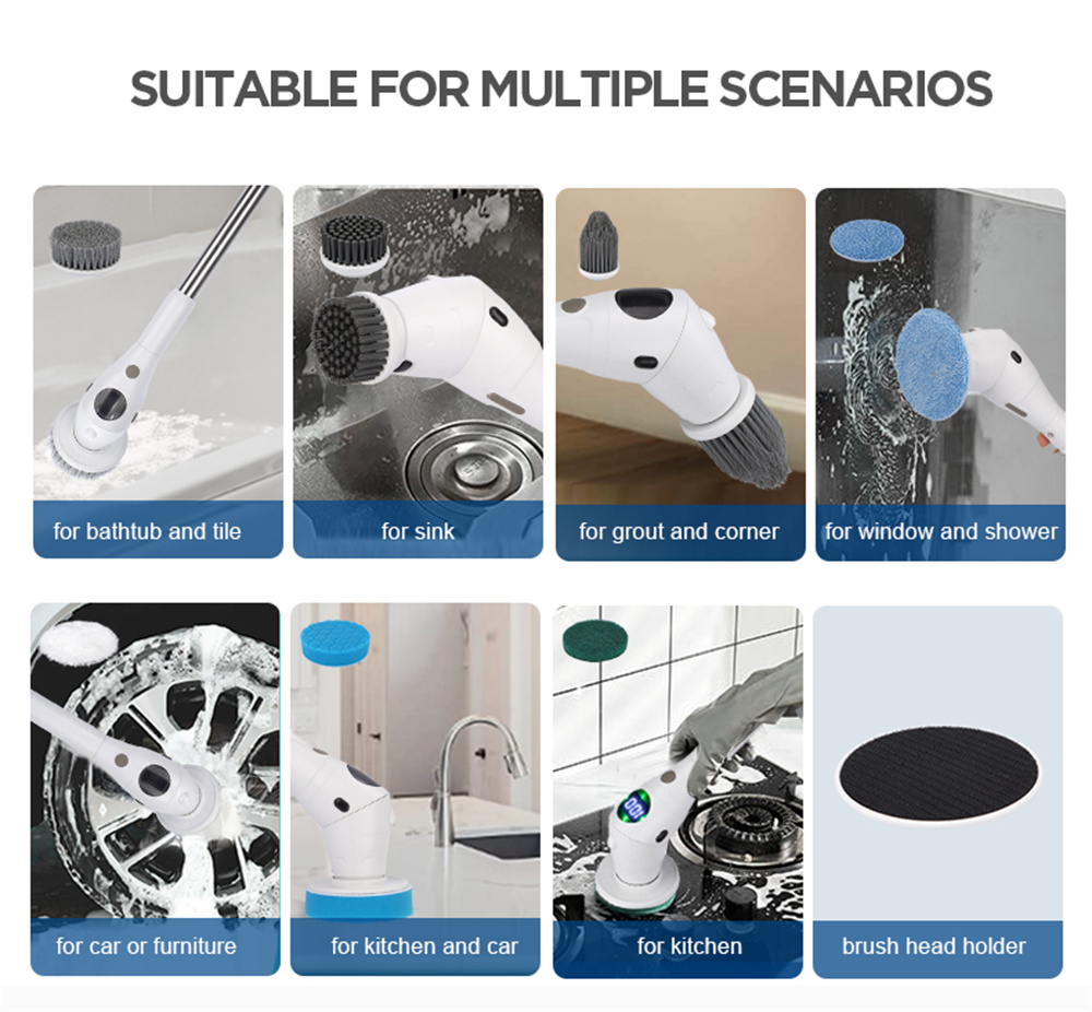 The power spin scrubber can easily change the brush heads, you can use different brush heads to clean bathrooms, kitchens, living rooms, bedrooms, cars, walls, bathtubs, tiled floors, ceilings or cookers. Alternatively, you can store them all in the storage bag provided. Please refer to the instructions and pictures for how to use the brush heads.