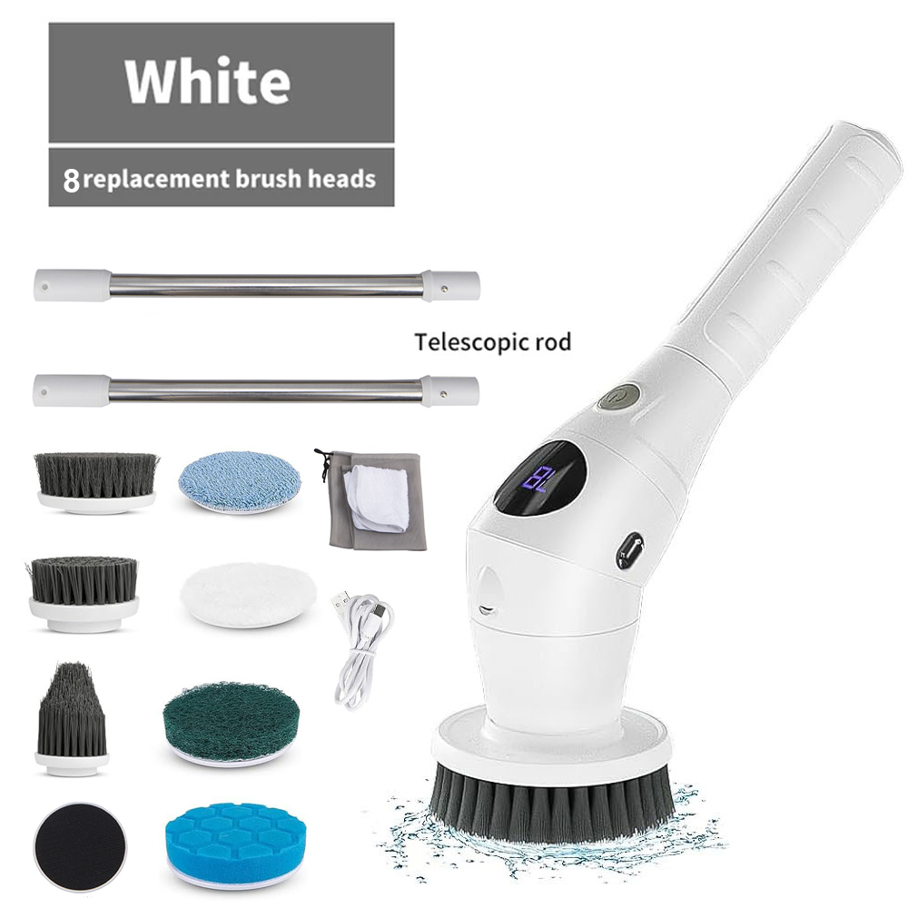 【8 interchangeable brush heads】 Electric scrubber contains 8 interchangeable cleaning brushes for different scenarios. Flat brush for surfaces such as tile floor, wall and pool; corner brush is ideal for cleaning grout, taps, edges; fabric brush for wooden floors and furniture cleaning; the sponge is for the window. In addition, you can even clean your car with these heads.