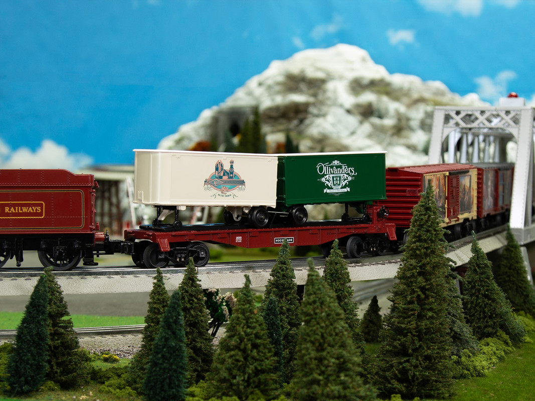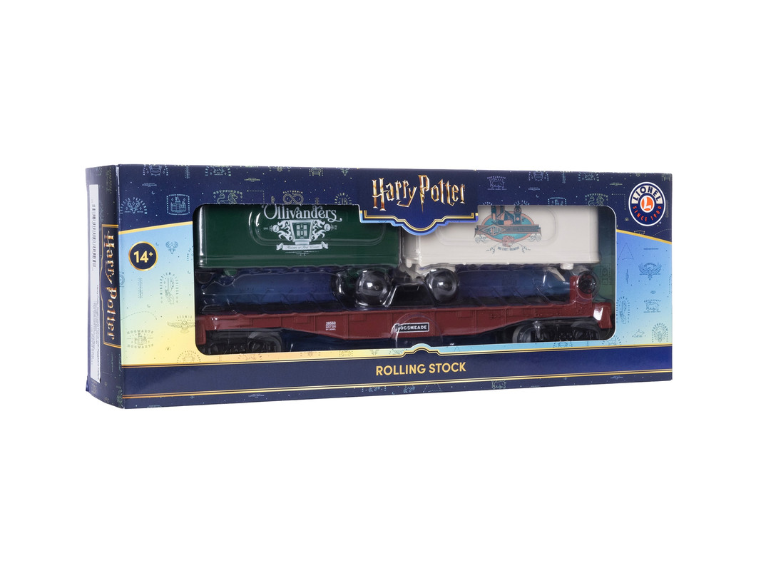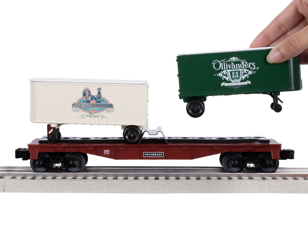 This is a Lionel 2528560 O Harry Potter Hogsmeade Flatcar with Piggyback Trailer. FLATCAR WITH PIGGYBACK TRAILERS FEATURES: Die-cast metal sprung trucks. Operating couplers. Two removable trailers on flatcar.