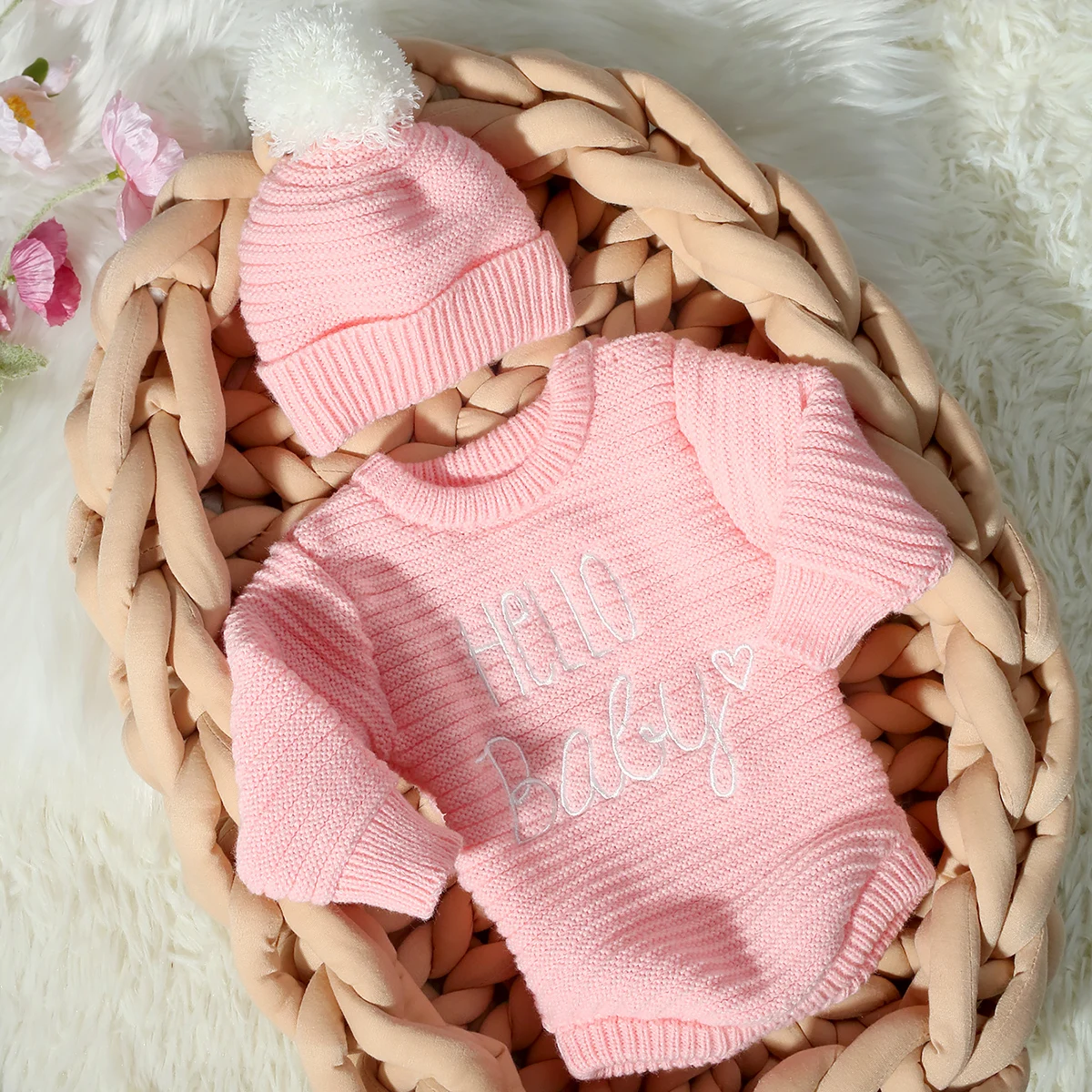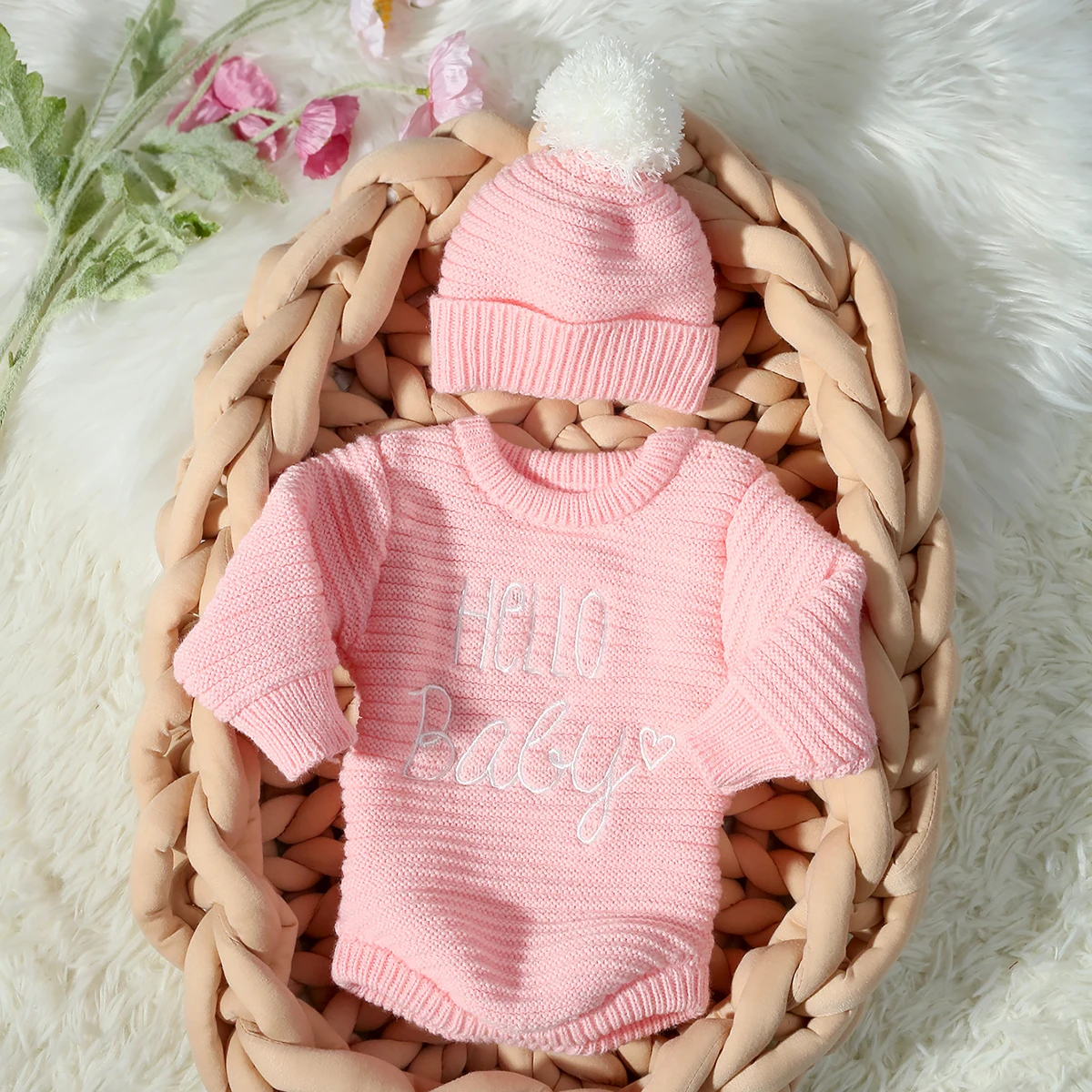 Ylsteed Hello Baby Newborn Photography Romper and Pom Hat Set Knitted Newborn Girl Outfits for Photo Shooting Infant Photo Props