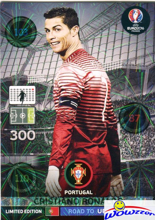 Wowzzer!!We have Imported this Awesome Product from EUROPE! Panini is NOT selling it in the United States! We are Very Proud to offer this Rare Amazing 2016 Panini Adrenalyn Road to UEFA EURO France EXCLUSIVE LIMITED EDITION Cristiano Ronaldo Card!  This Special Limited Edition Card was ONLY Found in Certain Blister packs and is very Tough to find since they are 6 different ones! BE sure to check out our other Panini Adrenalyn Products and other Cool Soccer Cards we Sell