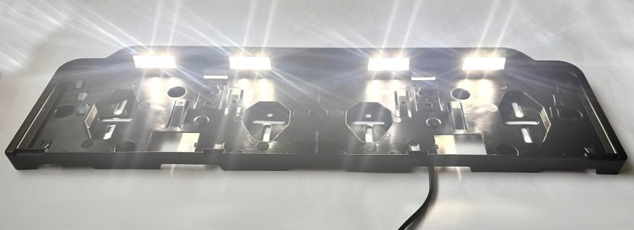 Universeller Kennzeichenhalter mit integrierter LED-Kennzeichenleuchte.