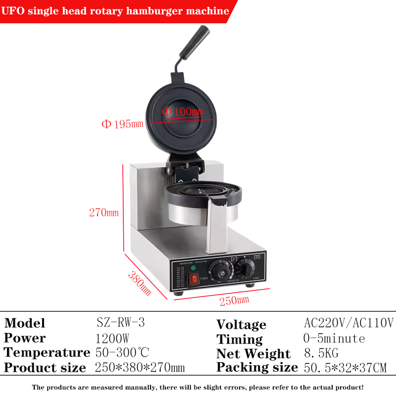 #1:Double-head UFO Burger Rotating Waffle Maker Model: HB-2 Power: 2600W Voltage:110V Material:Stainless steel Mold size: 100*50mm*2 Timing range: 1~5 minutes Temperature range: 50~300℃ Machine Weight: 19kg Package Weight: 21kg Machine size: 500*390*300mm Package size: 560*450*350mm #2:Single-head UFO Burger Ice Cream Waffle Maker