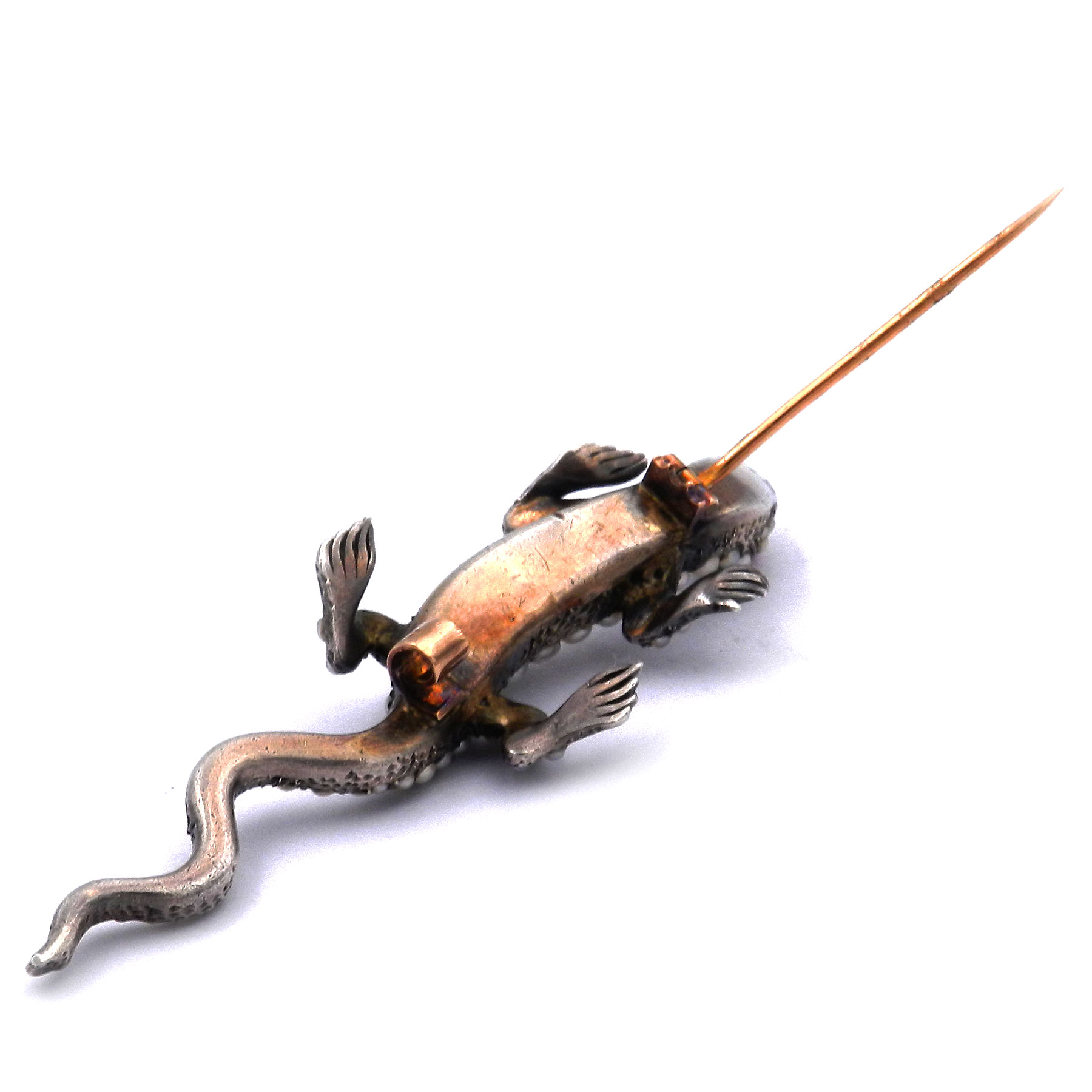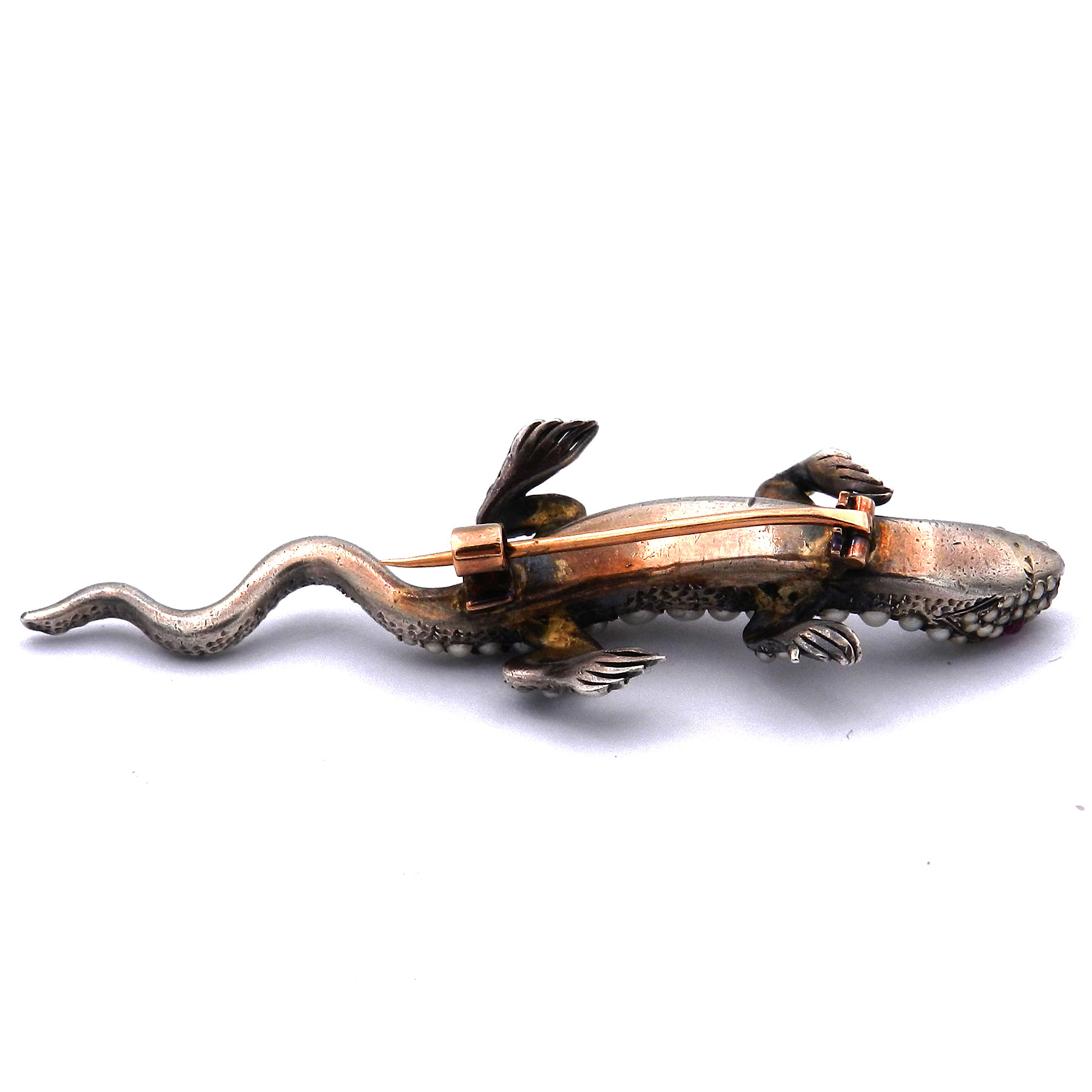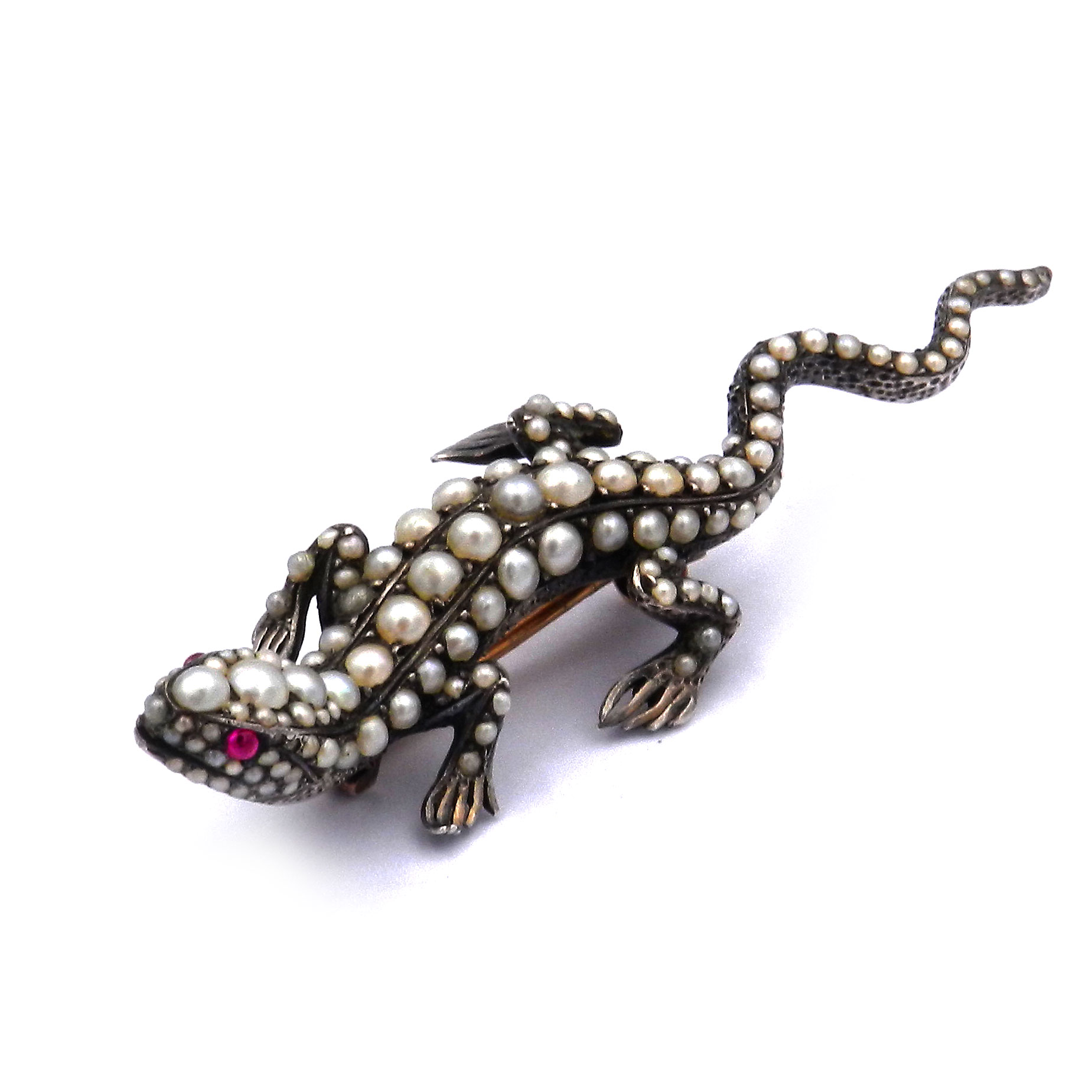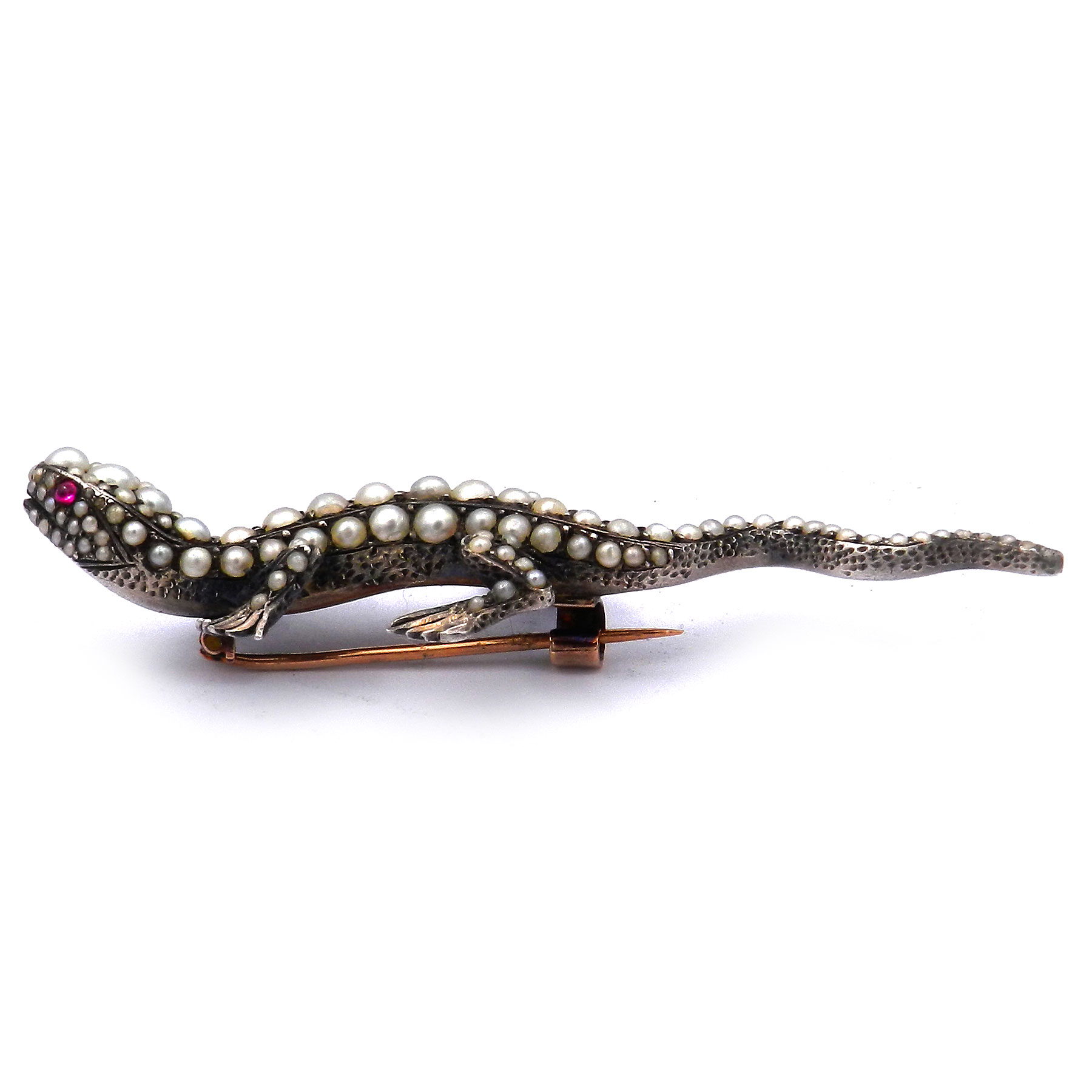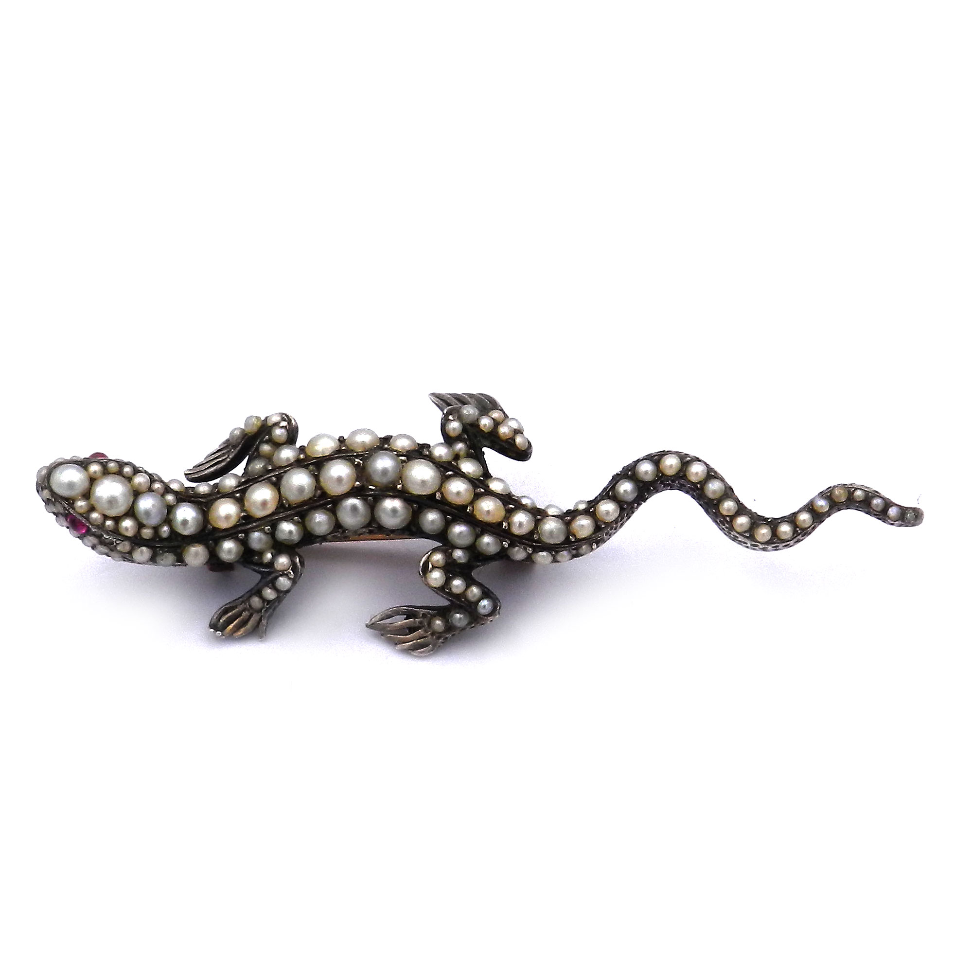 Entzückende antike Brosche in Form eines naturalistisch gestalteten Salamanders gefertigt aus massivem Silber. Der Körper des kecken Lurchs ist über und über mit Orientperlen besetzt, zwei rot leuchtende Rubine dienen als Augen. Mit einer Länge von 7 cm und einem Gewicht von fast 18 Gramm ist die feine Brosche sehr solide gearbeitet. Die rückseitige Nadel und der breite C-Haken sind aus 18K/750 Gold gearbeitet und garantieren guten Halt. Die historische Brosche ist wunderbar erhalten und ein seltenes Sammlungsstück.