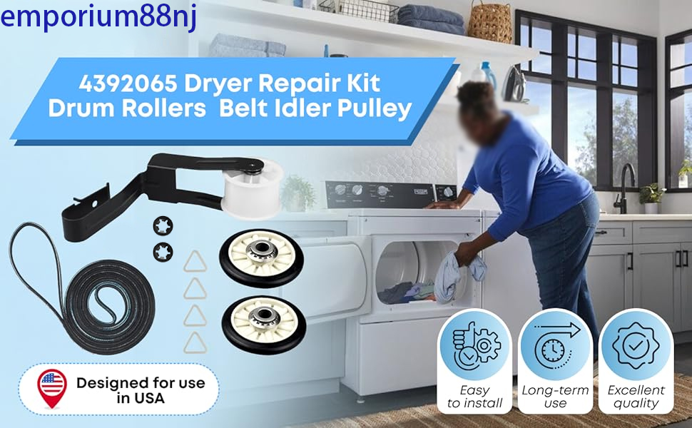 4392065 Dryer Repair Kit Drum Rollers Belt Idler Pulley For Maytag MEDC300BW0 MEDC200XW3 MEDC300XW0 Replacement Amana NGD4655EW2 NED4600YQ1 4GNED4600YQ1 Kenmore 80 NED4655EW1 Kenmore 500 Series 70 Series Etc