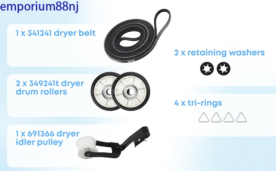 includes 1*341241 dryer belt, 2*341241t dryer drum rollers, 1*691366 dryer idler pulley, 2*retaining washers and 4*tri-rings