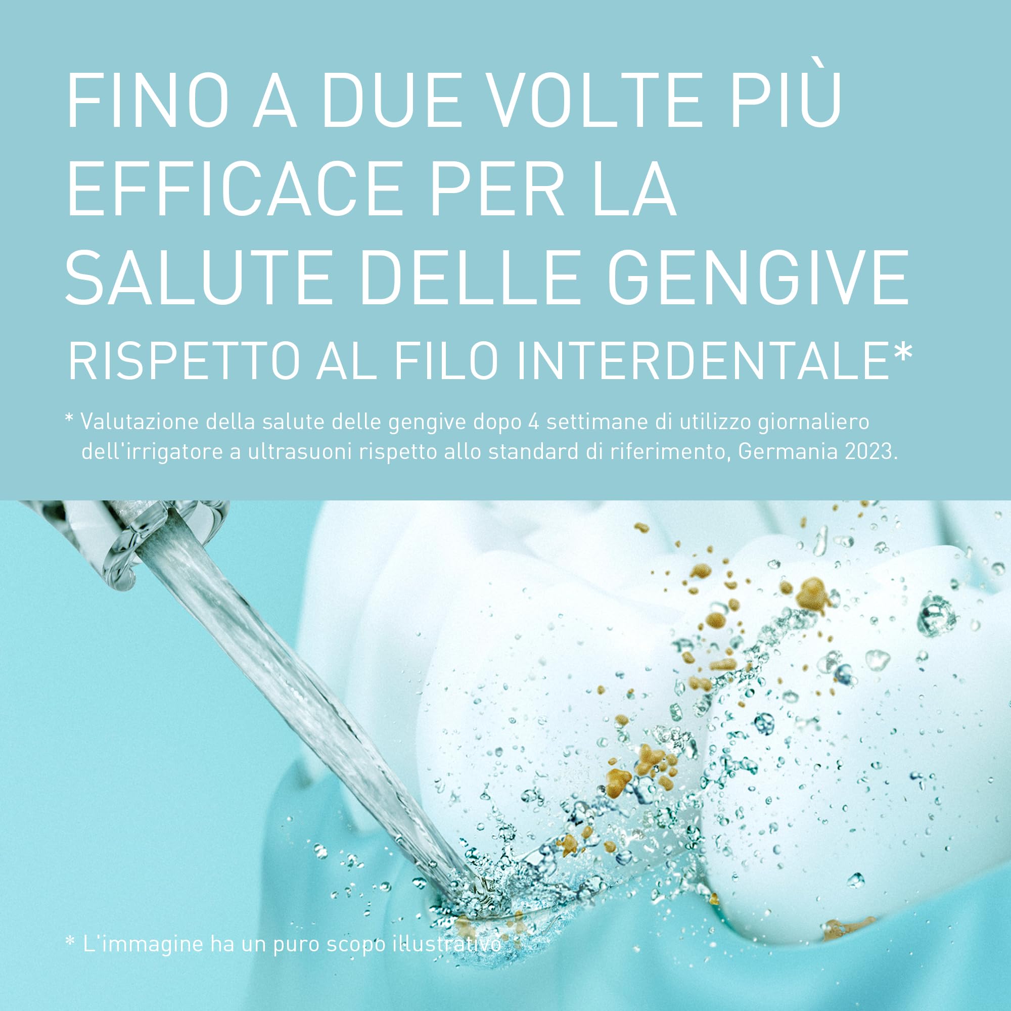 RIMUOVE LA PLACCA: Irrigatore cordless che rimuove fino al 99,9% della placca, eliminando residui di cibo e placca dalle aree interdentali difficili da raggiungere, per una pulizia profonda