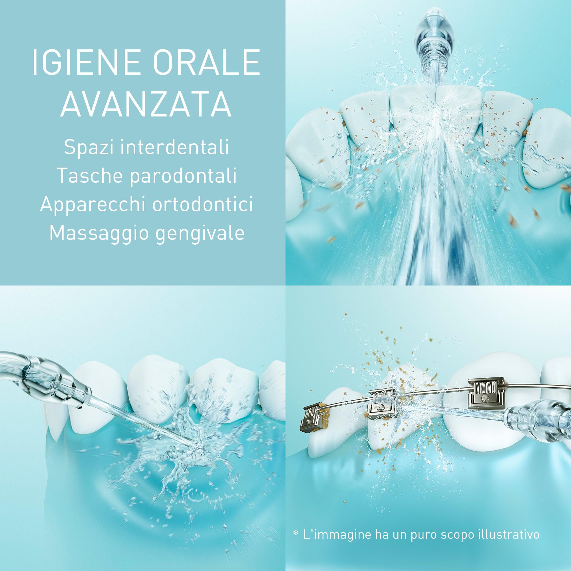 4 UGELLI INCLUSI: Include 1 ugello ortodontico (WEW0984W303), ideale per la pulizia di apparecchi ortodontoci come i brackets, 1 ugello per la pulizia della lingua (WEW0985W503) e 2 ugelli ultrasonico (WEW0986X503), progettato per un risciacquo rapido ed efficace.