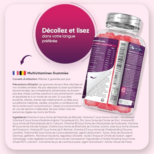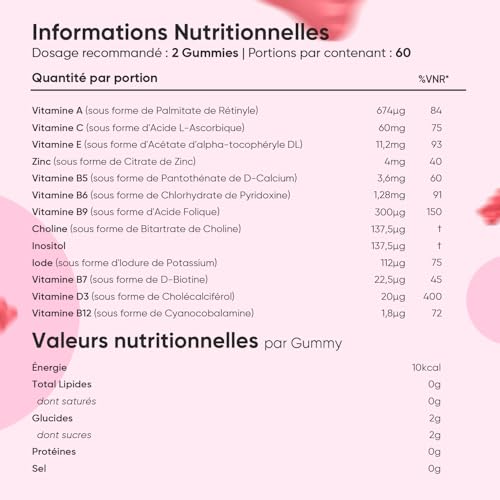 Gummies Multivitamines et Minéraux – Les gommes à mâcher multivitamines et minéraux sont formulées avec 13 vitamines et minéraux essentiels dont la Vitamine C, la Vitamine D3, la Vitamine B12, le Zinc, la Biotine, l’Iode, la Vitamine A,E, la Vitamine B6, B5, B9, l’Inositol et la Choline. Ces 120 gummies au délicieux goût de fraise nécessitent seulement 2 gummies par jour.