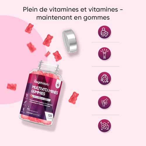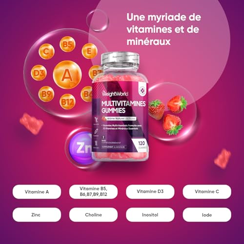 Gummies Multivitamines et Minéraux 120 Gummies Vegan 2 Mois de Stock, 13 Vitamines et Minéraux Essentiels, Vitamine C, Zinc, Vitamine B12, D3, E, Iode, A, B, Biotine, Arôme naturel de fraise
