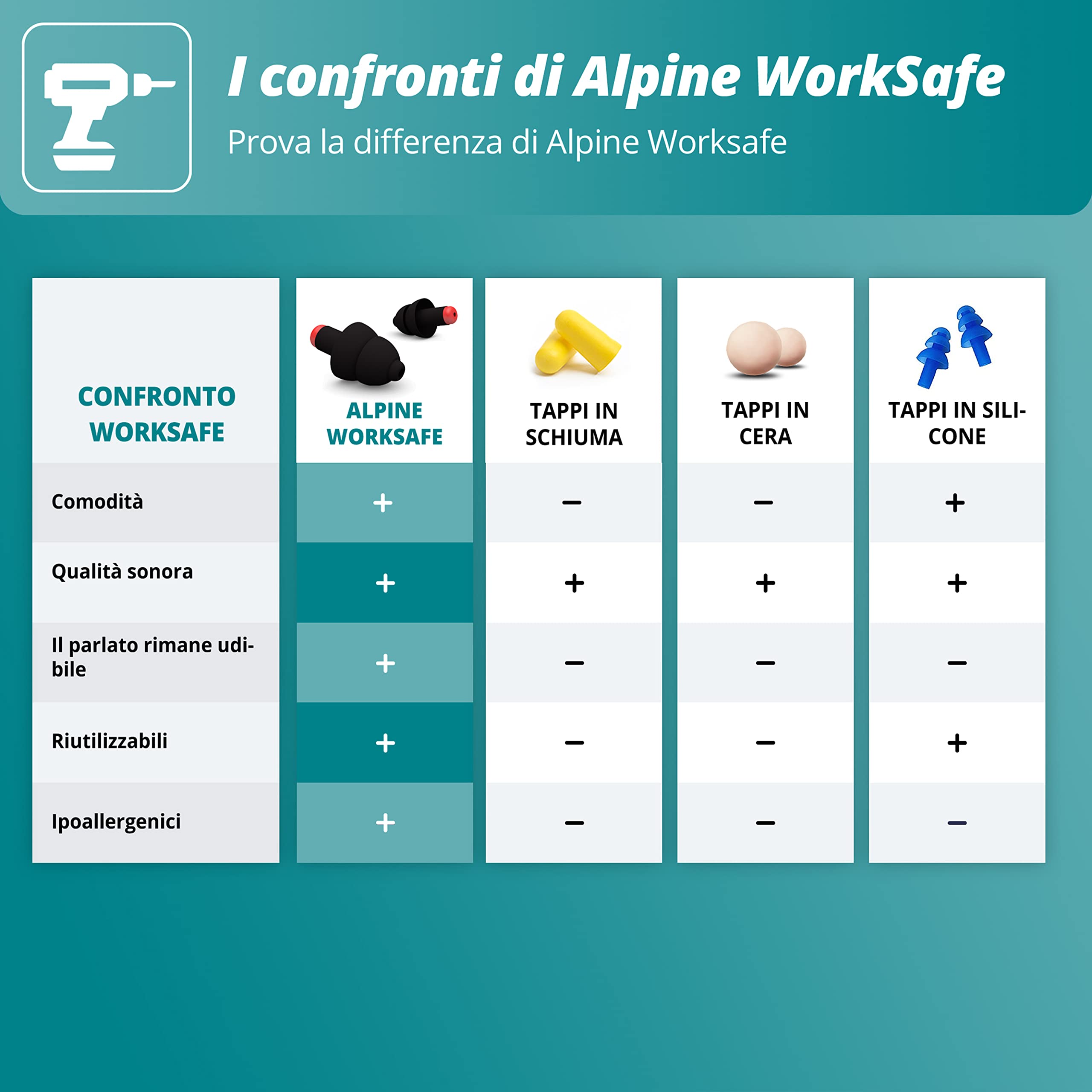 Moltissime persone fanno regolarmente lavori manuali in casa o lavorano giornalmente in ambienti molto rumorosi. Per questo gruppo, il rischio di soffrire di danni all'udito è alto. Tutte le persone che lavorano o fanno lavori manuali con molto rumore devono indossare delle buone protezioni per l'udito. Perforare, segare, levigare, smerigliare, martellare e falciare l'erba in e intorno a casa diventano molto confortevoli con i tappi speciali worksafe. Gli unici alpineacousticfilters attenuano i rumori dannosi ma garantiscono che si continuano a sentire le conversazioni e i rumori degli avvisi. Ideale per tutti gli amanti del fai-da-te che prendono seriamente la sicurezza e l'udito.alpineacousticfilters - sicurezza prima di tuttoi filtri speciali acustici nei tappi worksafe offrono un'attenuazione extra alta che impediscono tutti i rumori dannosi. Il rumore si riduce a un livello sicuro e si può lavorare senza problemi per otto ore. Grazie ai raffinati alpineacousticfilters si può continuare a parlare normalmente con gli altri amanti dei lavoretti manuali o colleghi. Si sentono anche i rumori di sicurezza. I filtri evitano la sensazione dell'ambiente chiuso.materiale alpinethermoshape molto confortevolei tappi worksafe hanno una forma molto piacevole. Sono prodotti con lo speciale materiale alpinethermoshape sviluppato da alpine che si forma nel condotto auricolare. Questo materiale si forma esattamente nel condotto auricolare e si pone nel punto giusto dell'orecchio. Il materiale è un'innovazione di alpine, ipoallergenico, non contiene siliconi e non provoca reazioni allergiche.tappo con modello rivoluzionariograzie alla sua esperienza di venti anni, alpine ha potuto sviluppare un nuovo modello ideale per i tappi. La forma ben pensata e ampliamente testata dei tappi garantisce un'attenuazione naturale e piatta e una linea fantastica. Modello speciale di tappi contro il rumorei tappi worksafe hanno un gambo allungato con il quale potete toglierli e metterli facilmente. I tappi sono neri e quindi si scoloriscono più lentamente e rimangono sempre perfetti.alpine cordino di supportoin ogni worksafe troverete l'alpine draagkoord in modo che i tappi possono essere messi e tolti in breve tempo ma sempre alla mano. Il cordino può essere fissato facilmente ai tappi. Dopo aver fissato il cordino sul lato del filtro, il funzionamento del filtro non è influenzato dal cordino.design olandesela forma delle protezioni per l'udito alpine è un design olandese esclusivo. Tutti i tappi e i sistemi dei filtri sono prodotti nei paesi bassi.