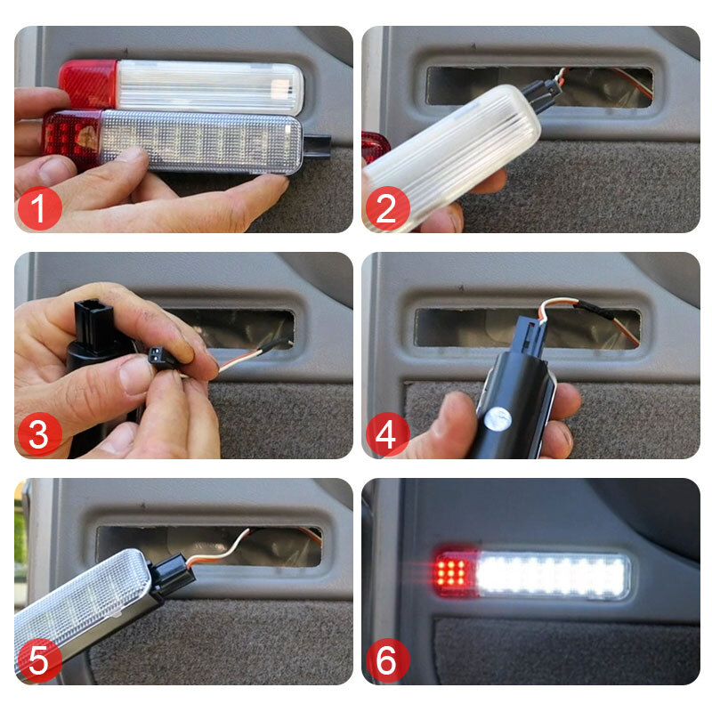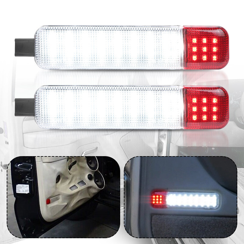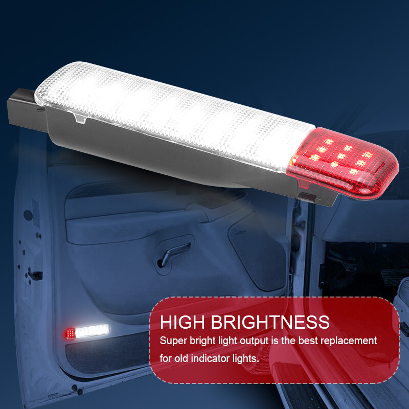 Specification: Type: LED interior door light Material: ABS plastic Lens color: clear + red Light color: white, red Light source: LED Voltage: DC 12V Vehicle placement: front, left, right Plug and play, no modification required