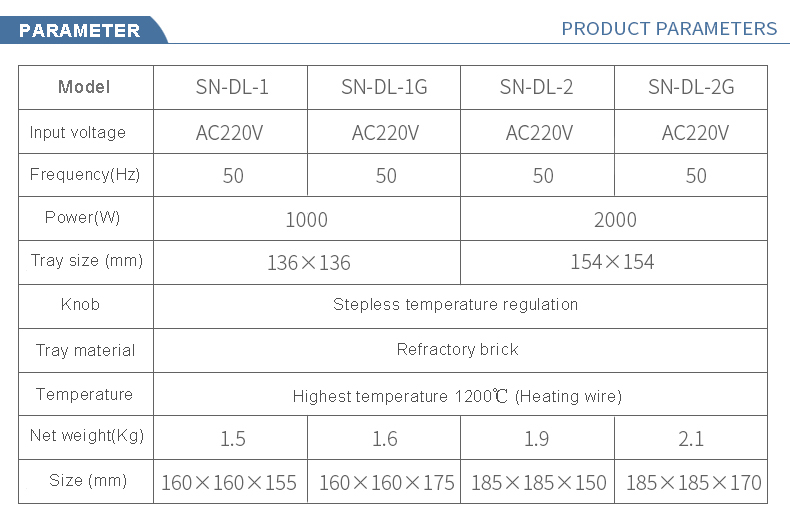 1. Stepless temperature adjustment, simple operation, suitable for heating various appliances. 2. Refractory brick tray, high temperature resistance without cracking 3. Nickel-chromium resistance wire heating, heating up quickly, up to 1200℃. 4. With refractory brick cover, less heat loss and high heating efficiency. 5. The shell is made of high-quality stainless steel, corrosion-resistant. Product parameters:
