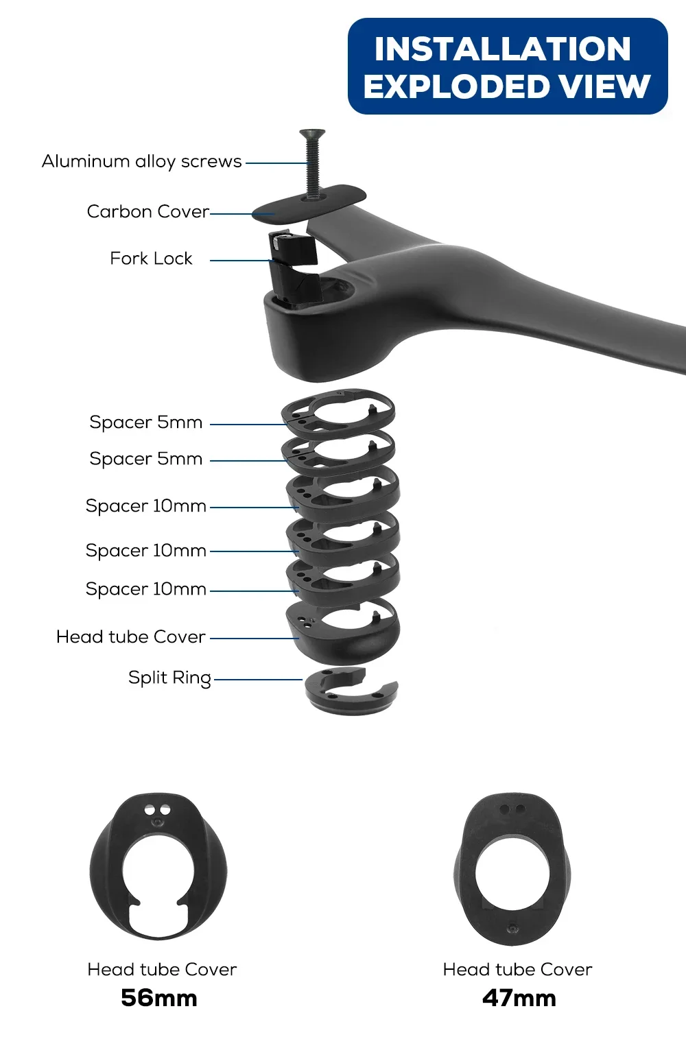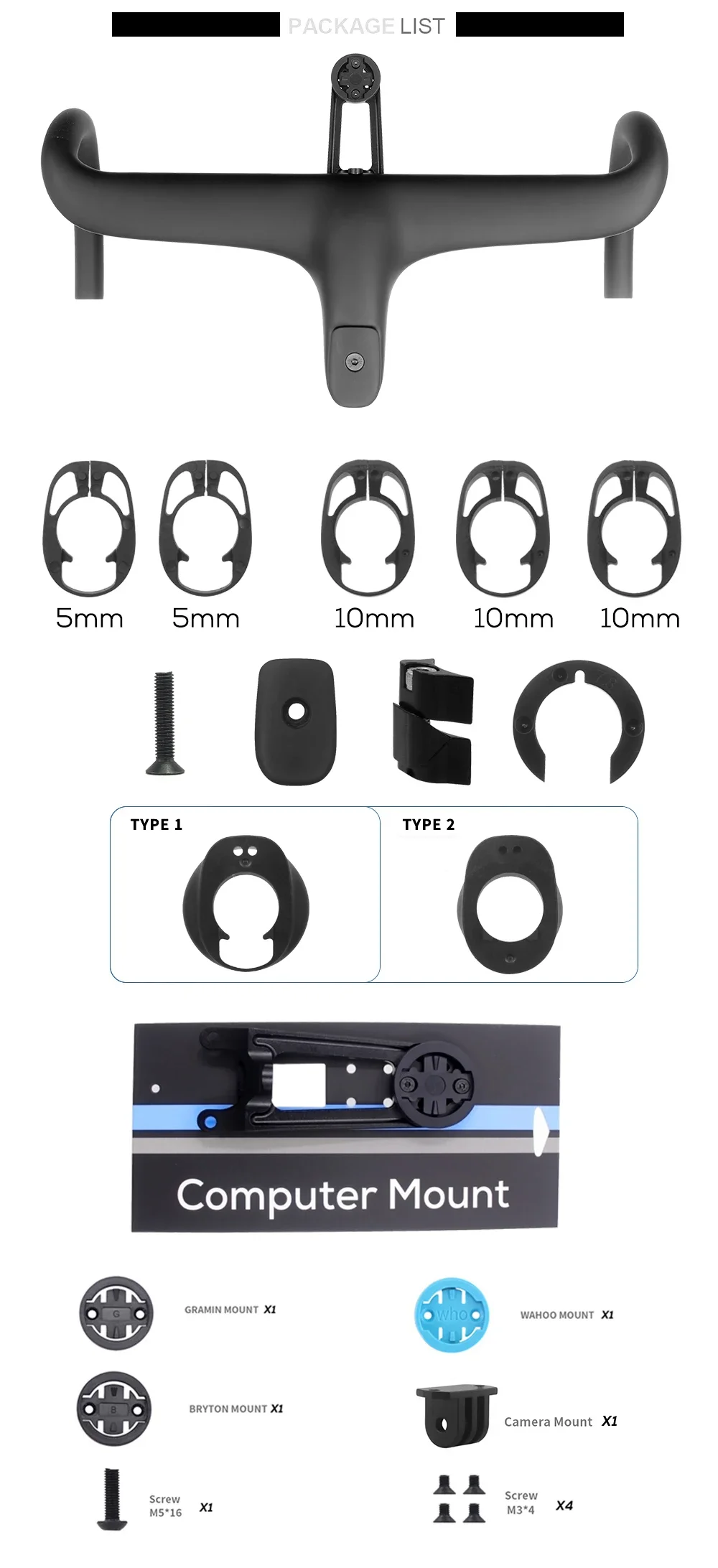 Package contains: carbon fiber handlebar, carbon fiber cover, plastic spacer, computer mount, screws, handlebar lock