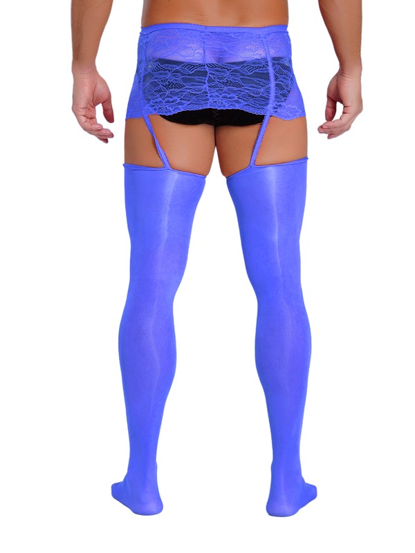 Semi see-through lace mini skirt for men has comfortable elastic waistband, and matches with stockings.