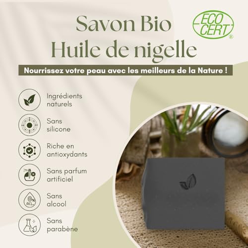 Profitez des bienfaits naturels avec Savon à l’Huile de Nigelle Bio Soin Réparateur Purifiant et Apaisant pour Peaux Sensibles, un savon bio enrichi en actifs hydratants et apaisants. Il convient aux peaux sensibles et assure un nettoyage en profondeur tout en douceur