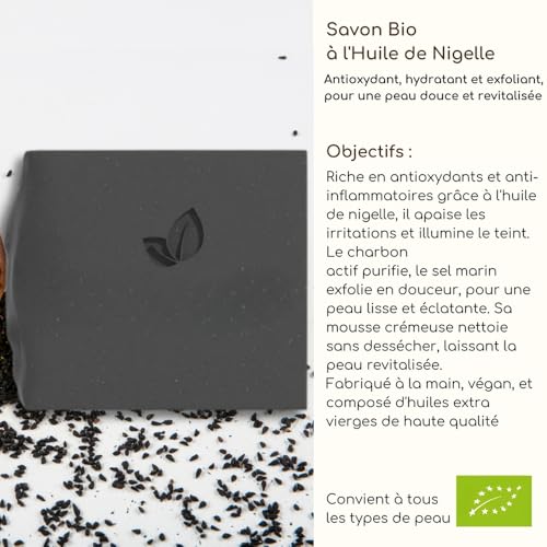 Ce savon à l’huile de nigelle bio est une formulation riche et naturelle, idéale pour le soin de la peau. Enrichi en huile d’olive et en huile de coco, il apporte une hydratation intense et nourrit la peau en profondeur. L’huile de nigelle, connue pour ses propriétés anti-inflammatoires et antioxydantes, aide à apaiser les irritations et à améliorer le teint. Le charbon actif joue un rôle clé dans la purification de la peau en éliminant les impuretés et les toxines, tandis que le sel marin contribue à exfolier en douceur, laissant la peau lisse et lumineuse. Ce savon est parfait pour tous types de peau, même les plus sensibles, et offre une expérience de nettoyage douce mais efficace. Avec sa mousse légère et crémeuse, il nettoie délicatement sans assécher, tout en revitalisant la peau. L’huile de nigelle, également appelée huile de cumin noir ou huile de graine de nigelle (Nigella sativa), est utilisée depuis des siècles pour ses nombreux bienfaits sur la santé. Convient à tous les types de peau, ce savon naturel est élaboré à partir d’huiles extra vierges de haute qualité, offrant un nettoyage intensif et doux. Fabriqué à la main par un procédé de pressage à froid, il est entièrement végétalien et 100 % d’origine naturelle. Nous n’utilisons que des ingrédients de qualité alimentaire, garantissant que seul le meilleur se retrouve dans notre savon. Ingrédients principaux: Huile d’olive*, huile de coco*, huile de nigelle*, huile de ricin*, sel marin, charbon actif. * = Biologique Points forts : Ingrédients 100 % bio : Formulé avec des huiles et ingrédients certifiés biologiques. Sans ajout d’huile de grignons. Sans ajout d’huile raffinée. Convient à tous types de peau : Adapté pour les peaux sèches, grasses, sensibles ou mixtes. Propriétés purifiantes : Le charbon actif et le sel marin éliminent les impuretés et exfolient doucement. Riche en nutriments : L’huile de nigelle apporte des bienfaits antioxydants et anti-inflammatoires. Hydratation et douceur : L’huile d’olive et l’huile de coco nourrissent la peau sans l’agresser. Écologique et sans produits chimiques : Sans sulfates, parabènes ou colorants artificiels. Liste des ingrédients: Olea Europaea Fruit Oil*, Cocos Nucifera Oil*, Sodium Hydroxide*, Aqua*, Nigella Sativa Seed Oil*, Ricinus Communis Seed Oil*, Maris Sal, Charcoal Powder