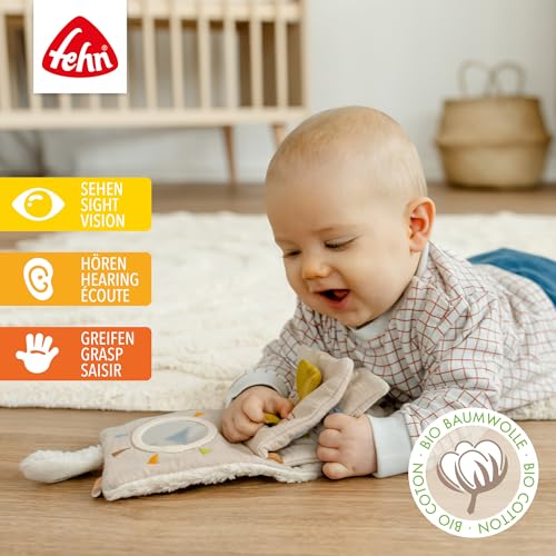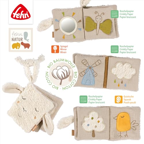 Fehn Livre en Tissu Mouton Nature – Livre d'images en Coton Issu de l'agriculture Biologique – stimule Les Sens et la motricité – pour la Maison et en déplacement – pour Les bébés dès la Naissance