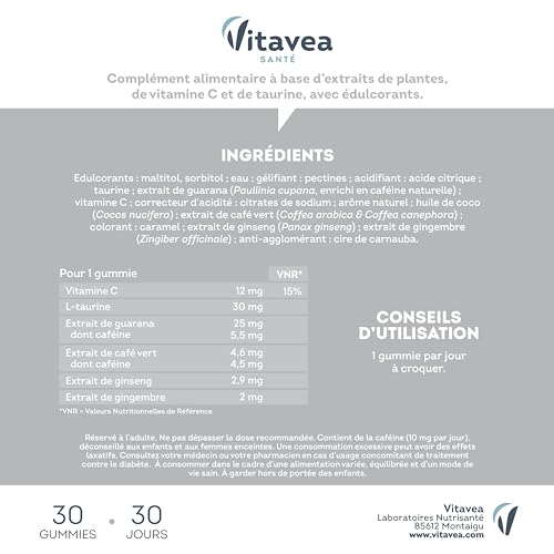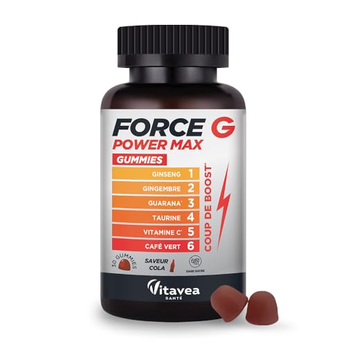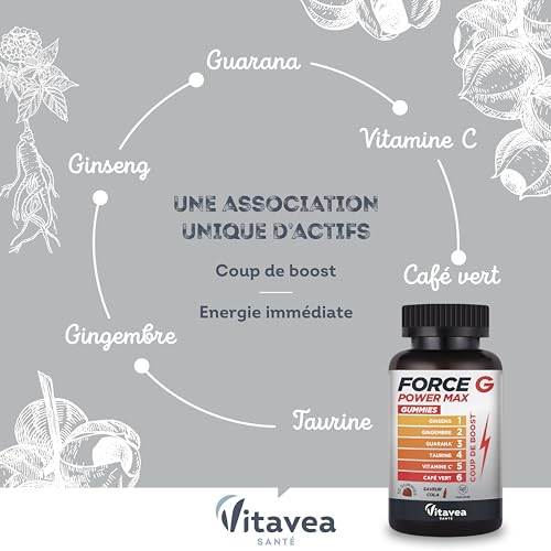 Vitavea - Gummies Force G Power Max - Fatigue, Energie, Coup de Boost Immédiat - Ginseng, Gingembre, Guarana, Taurine, Vitamine C, Café Vert - Sans Sucre - Vegan - 30 gummies, 30 jours