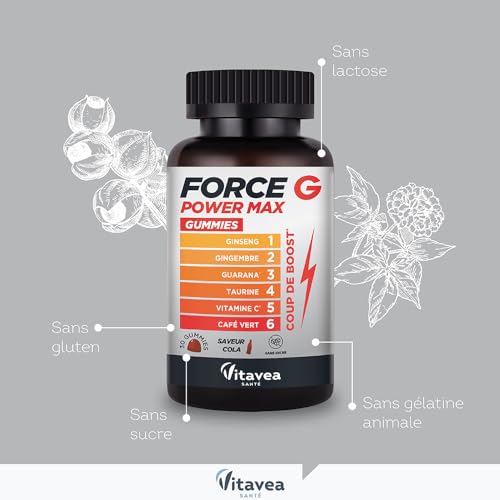 😋 PRATIQUE ET GOURMAND : Nos gummies au bon goût de cola sont un allié pour retrouver énergie, vitalité et tonus rapidement ! Pour bénéficier de tous les bienfaits de nos gummies Force G Power Max, prendre 1 gummie par jour. Nos gummies à base de guarana, ginseng, gingembre, taurine, café vert et vitamine C sont vegans et formulées sans sucre, sans arôme ni colorant artificiels, sans gélatine, sans lactose et sans gluten.