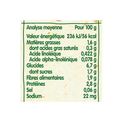 INGREDIENTS 100% D’ORIGINE NATURELLE : Sans résidus de pesticides* (*taux inférieurs à 0,000001 %, conformément aux règles de l’alimentation infantile), Sans sel ajouté